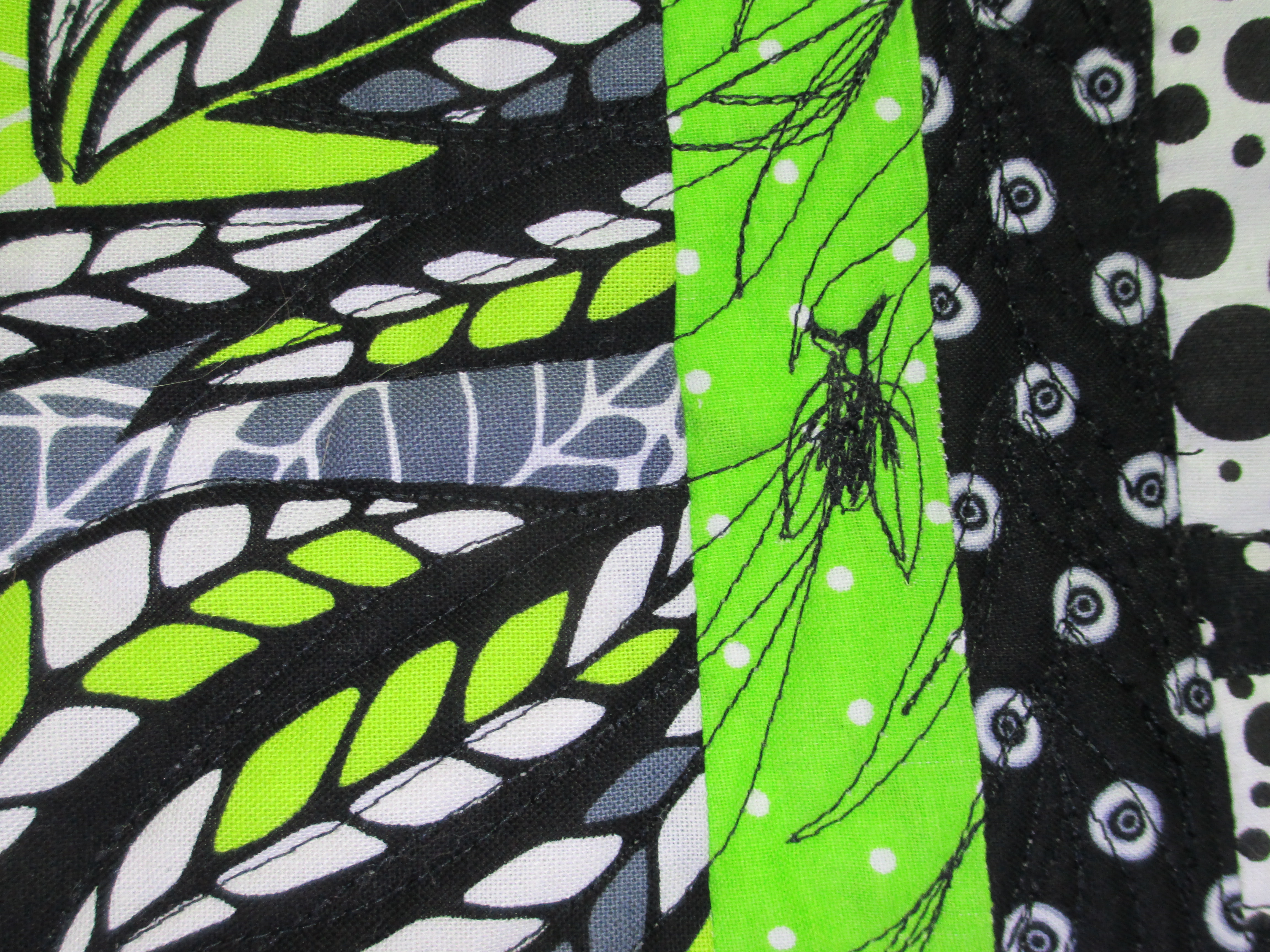 The customer wanted the leaves to extend out into the green and black borders, so I thought an insect would be cute here. This is supposed to be a fly. It looks like a tangled mess to me. So, I will be ripping that out with one of my new best friends. The other insects look like they need to go to Weight Watchers, but because I have already spent over 30 hours on this quilt, they are just going to have to content eating on the fabric leaves of this quilt. I feel like I have failed this customer because so much of the quilting looks like scribbling.
