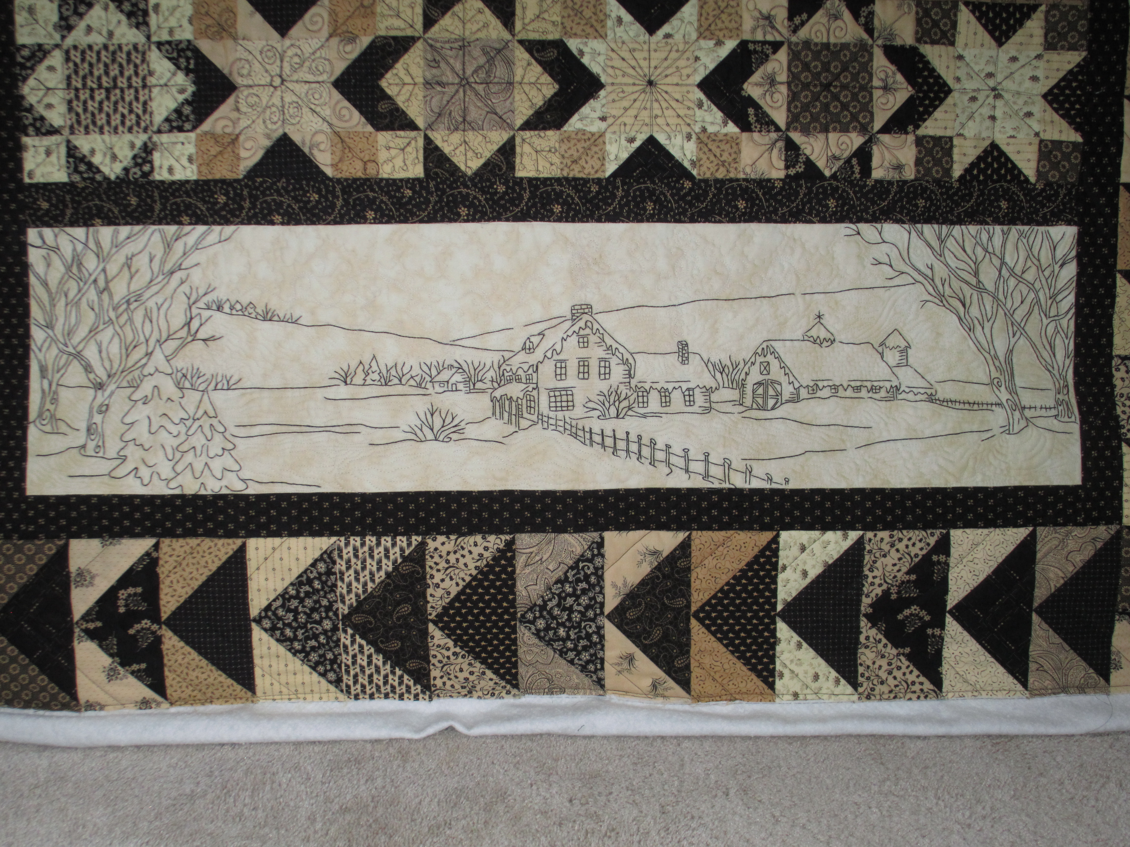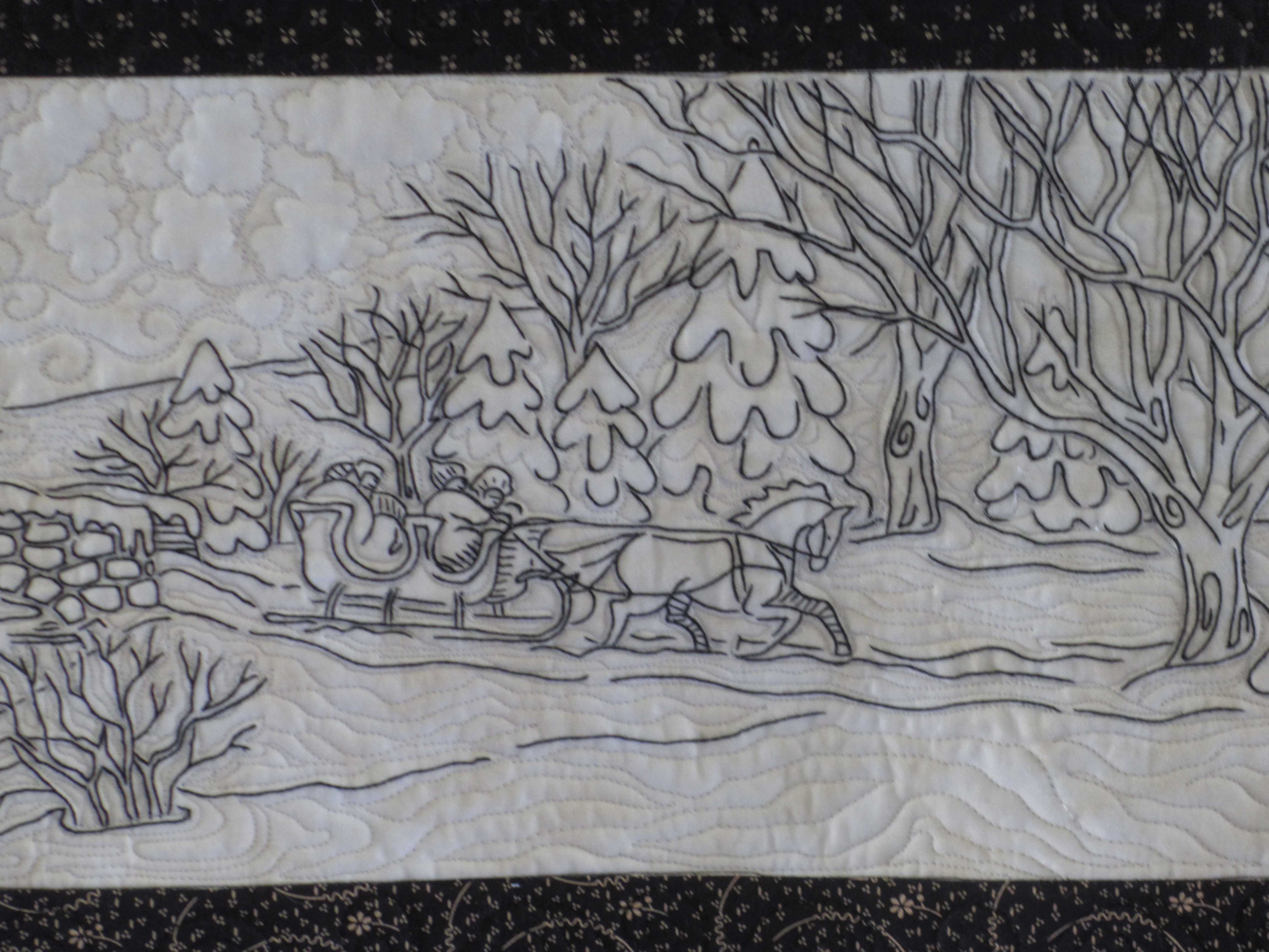 Elaine’s other quilt is appropriately named “Over the River and Through the Woods.”  Here’s a shot of the entire quilt.  Not only does Elaine do wonderful embroidery work, she also does a great job of piecing her quilts.  I am so glad I ?specialize? in quilting, because my piecing leaves a lot to be desired.  :\