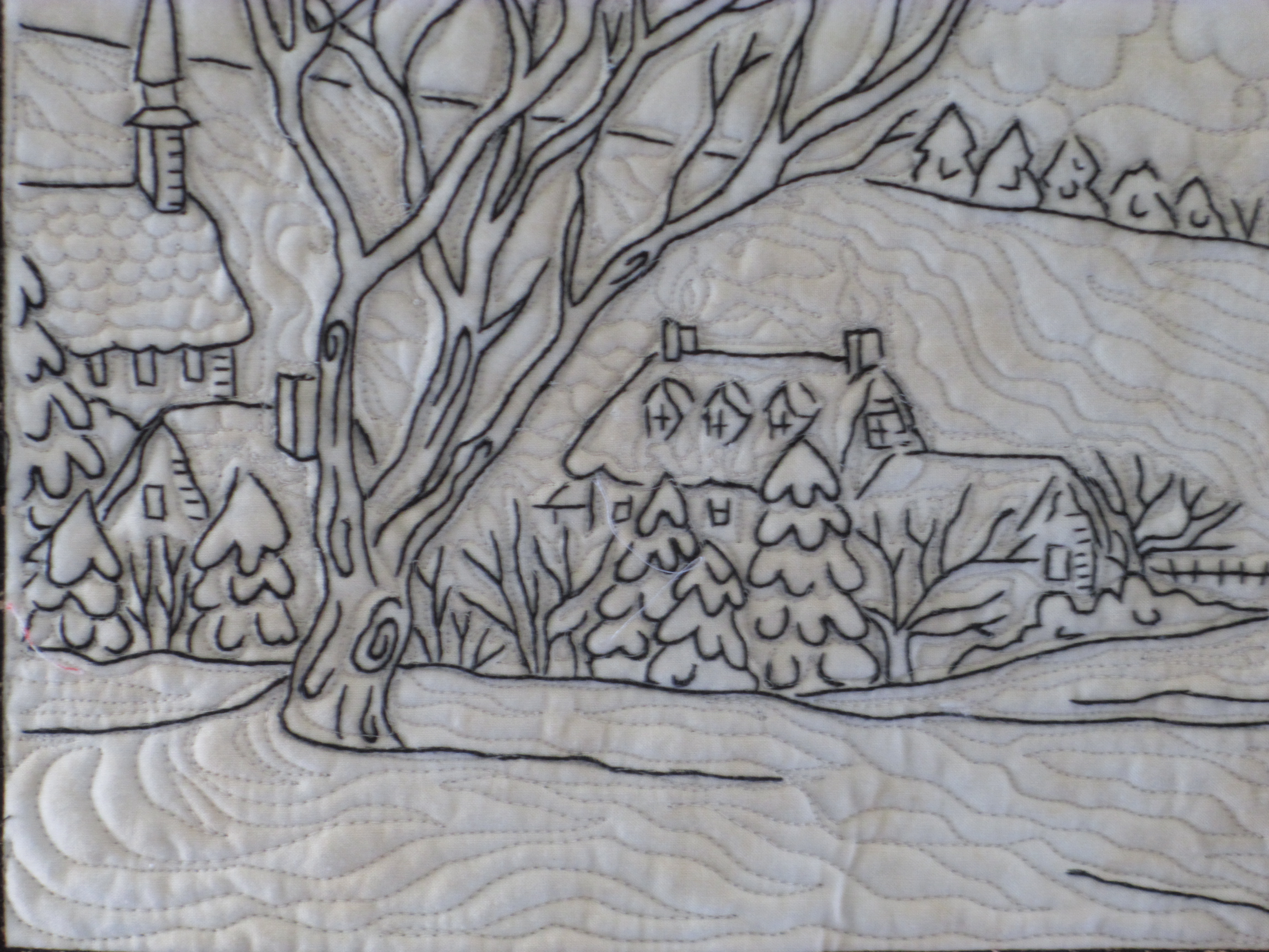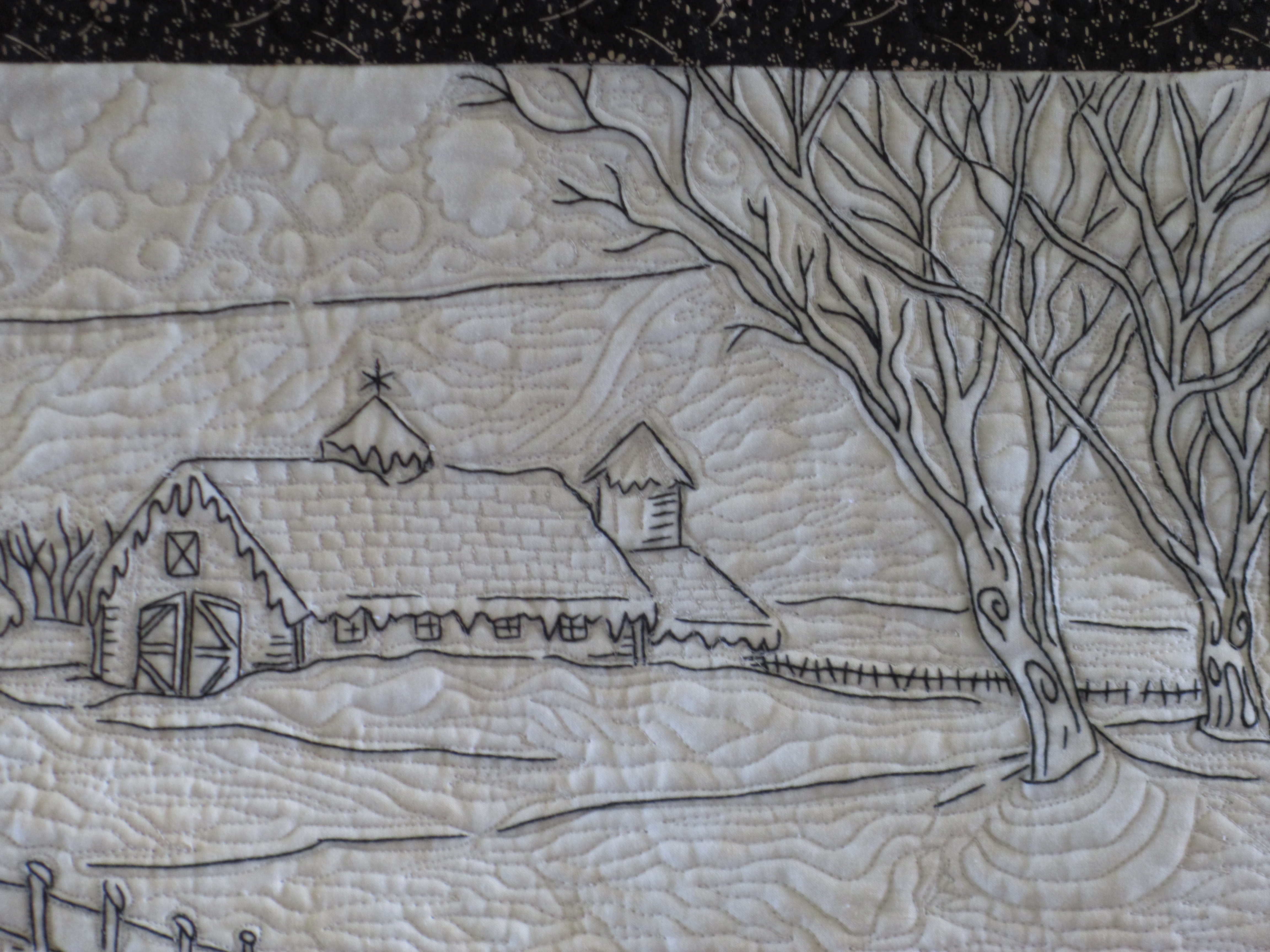 Those 2 lines sloping down to the barn in the picture on the left are supposed to be sled tracks.  Can you see the stick skier coming down the hill in the picture on the right?  I had too much fun drooling doodling on these quilts!  And, Elaine was a sweetheart for letting me!