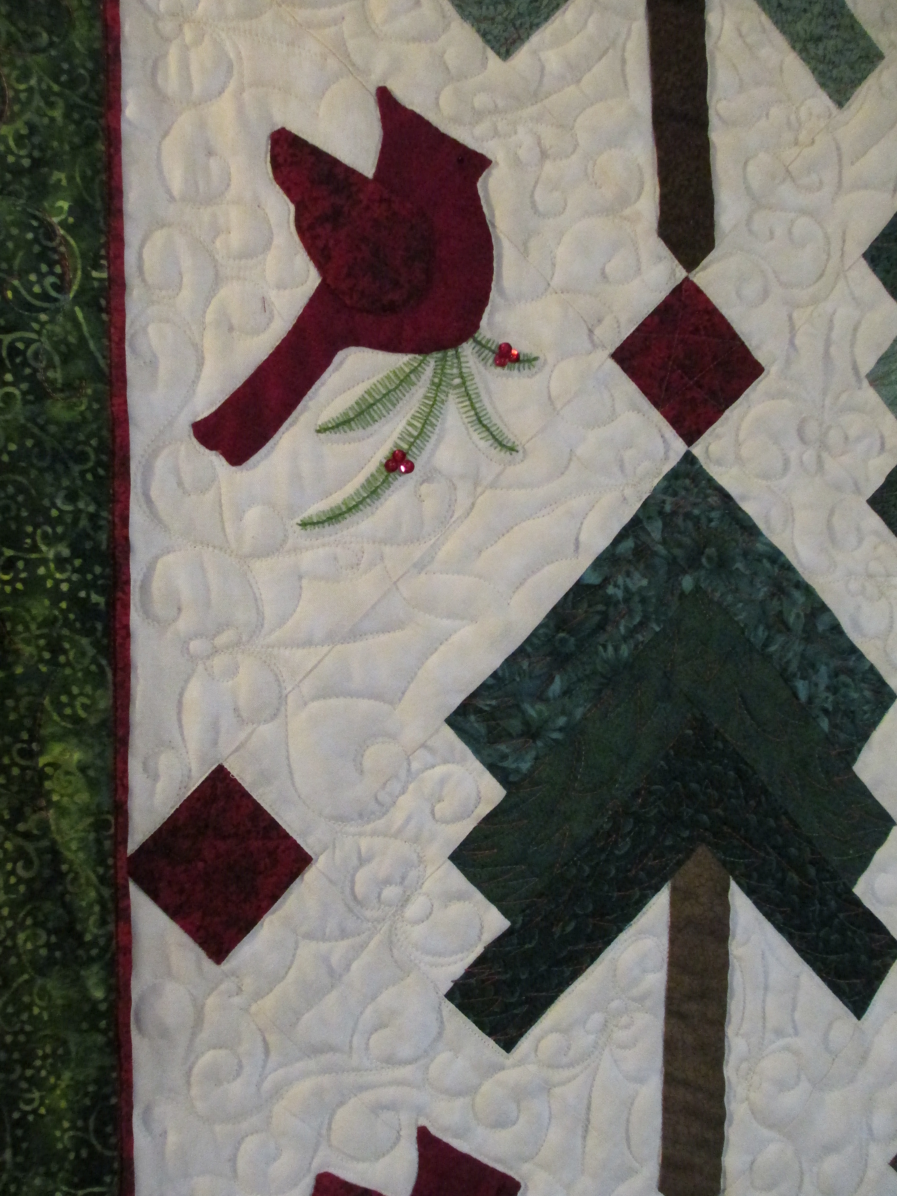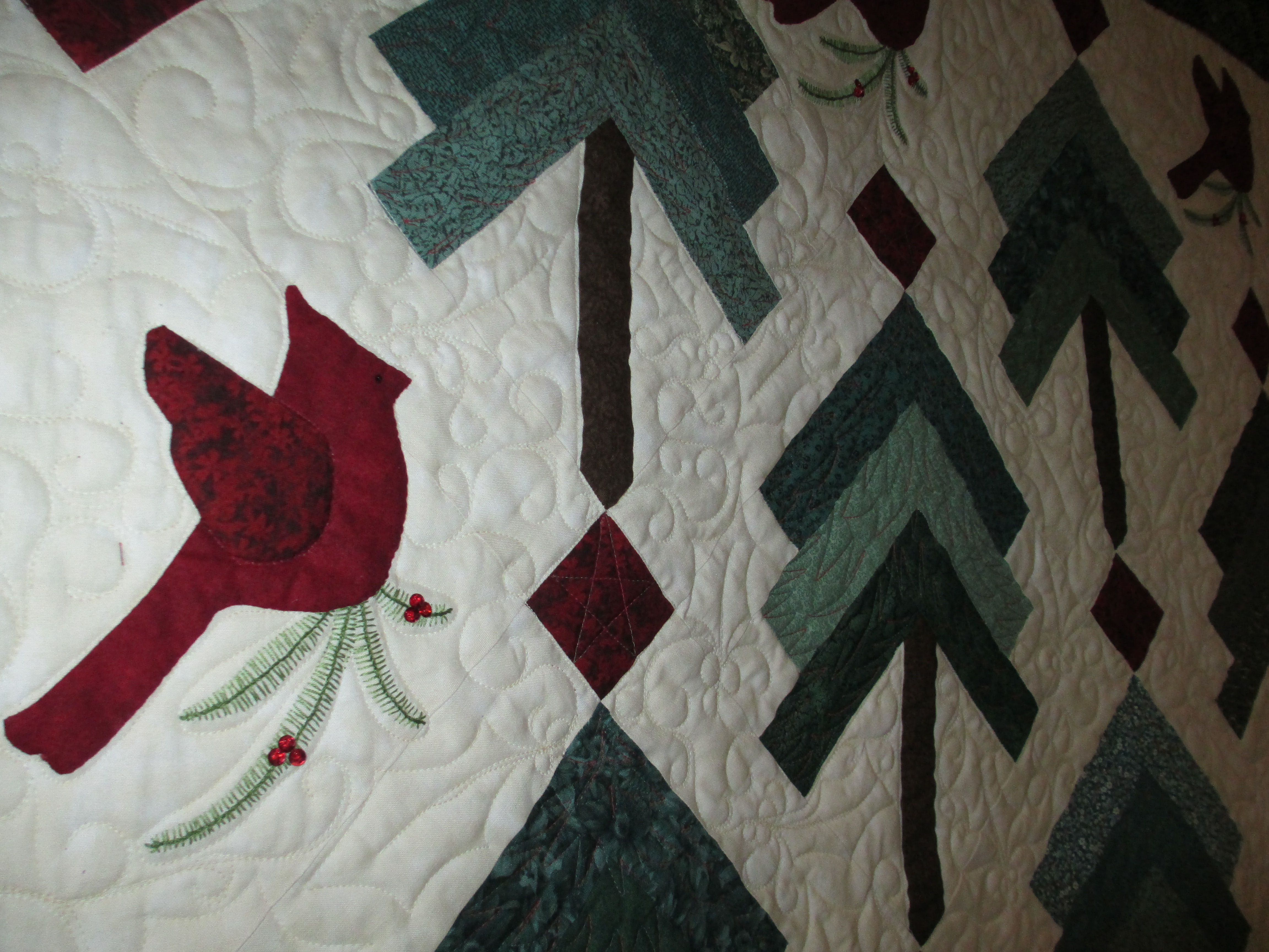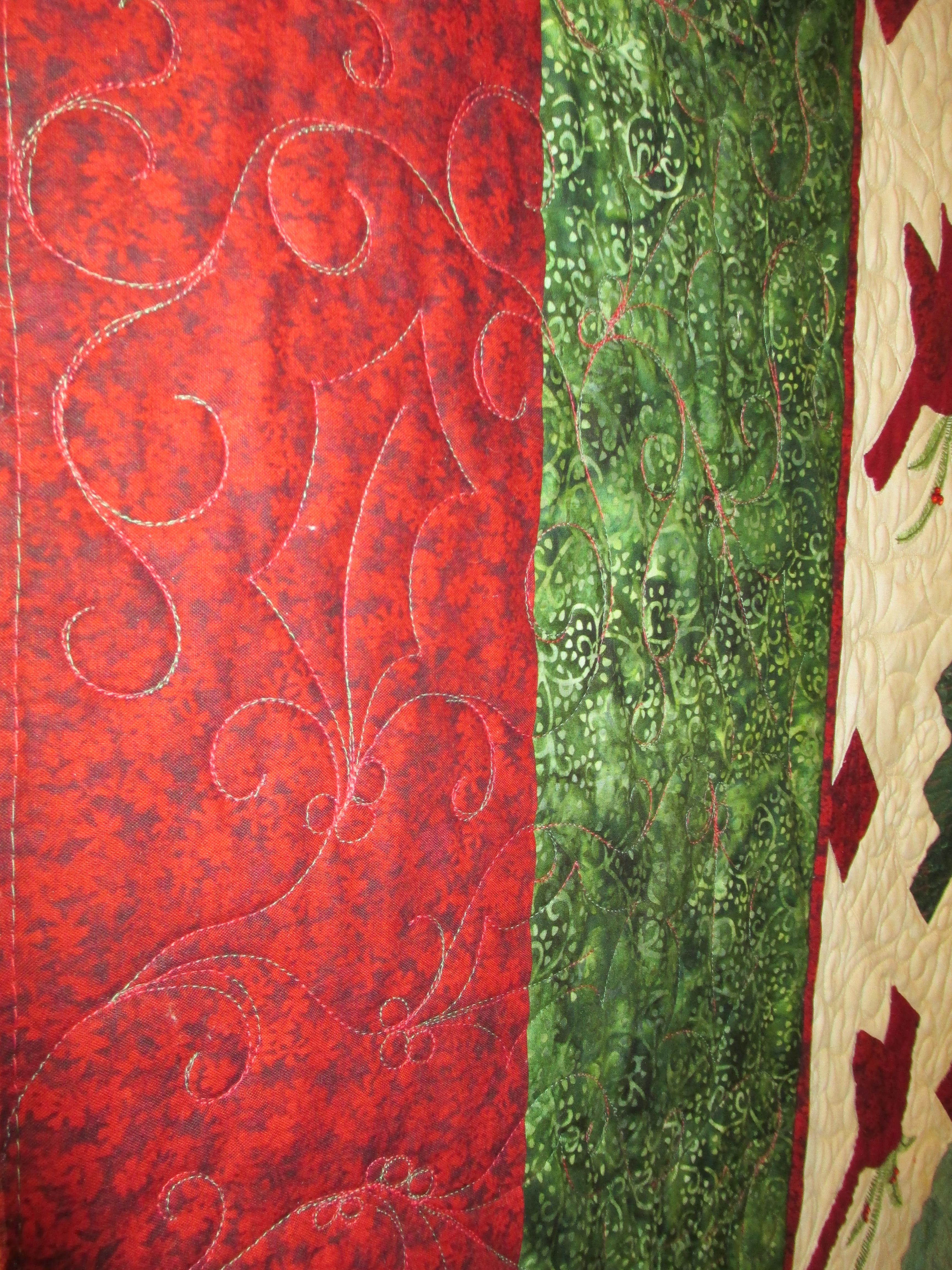 For the most part, I quilted holly and swirls throughout the quilt, but I added “branches” to the trees, which you cannot see in any of these pictures. Diane chose a variegated red and green thread for the borders and trees and a cream color for the background.