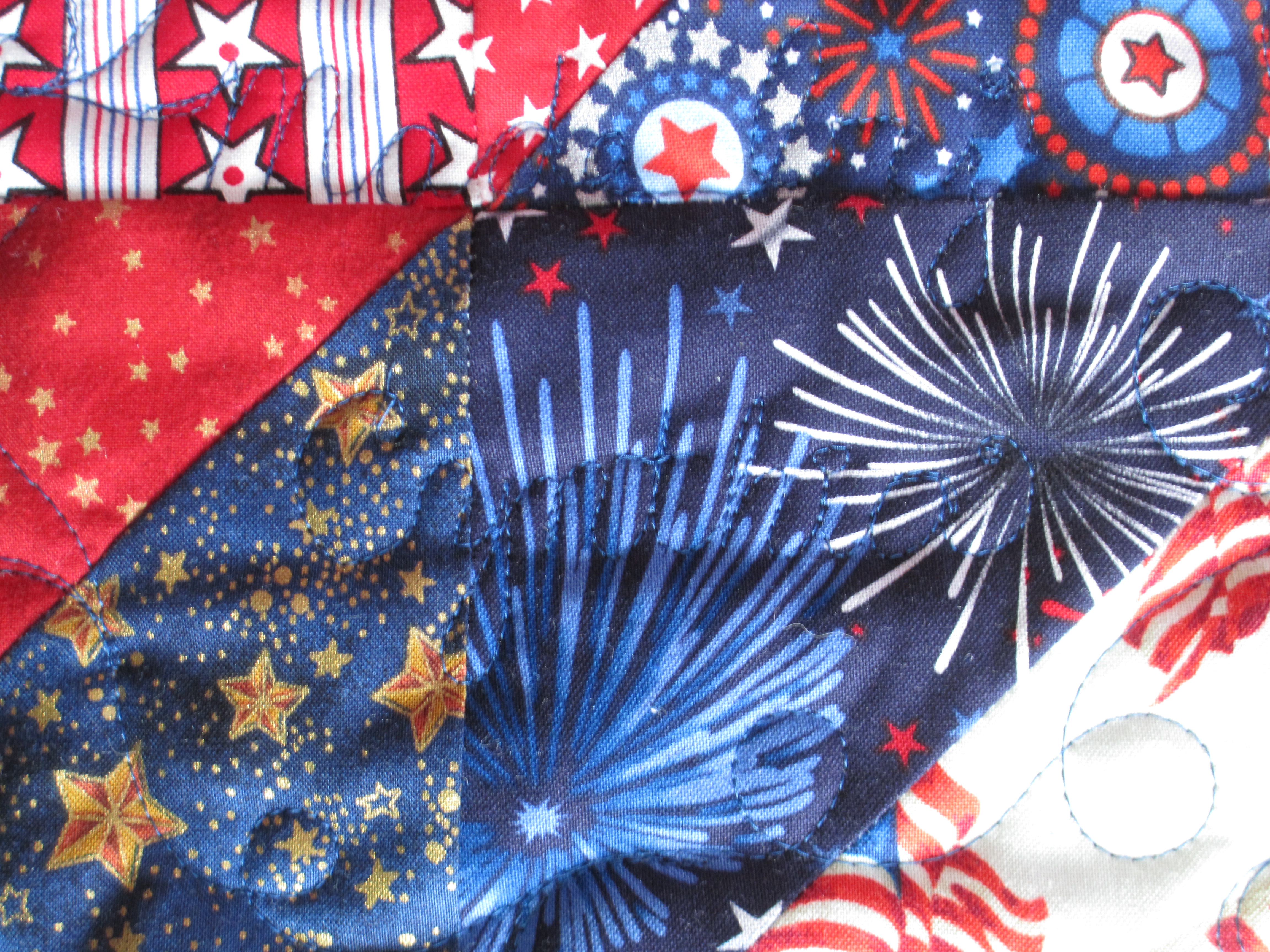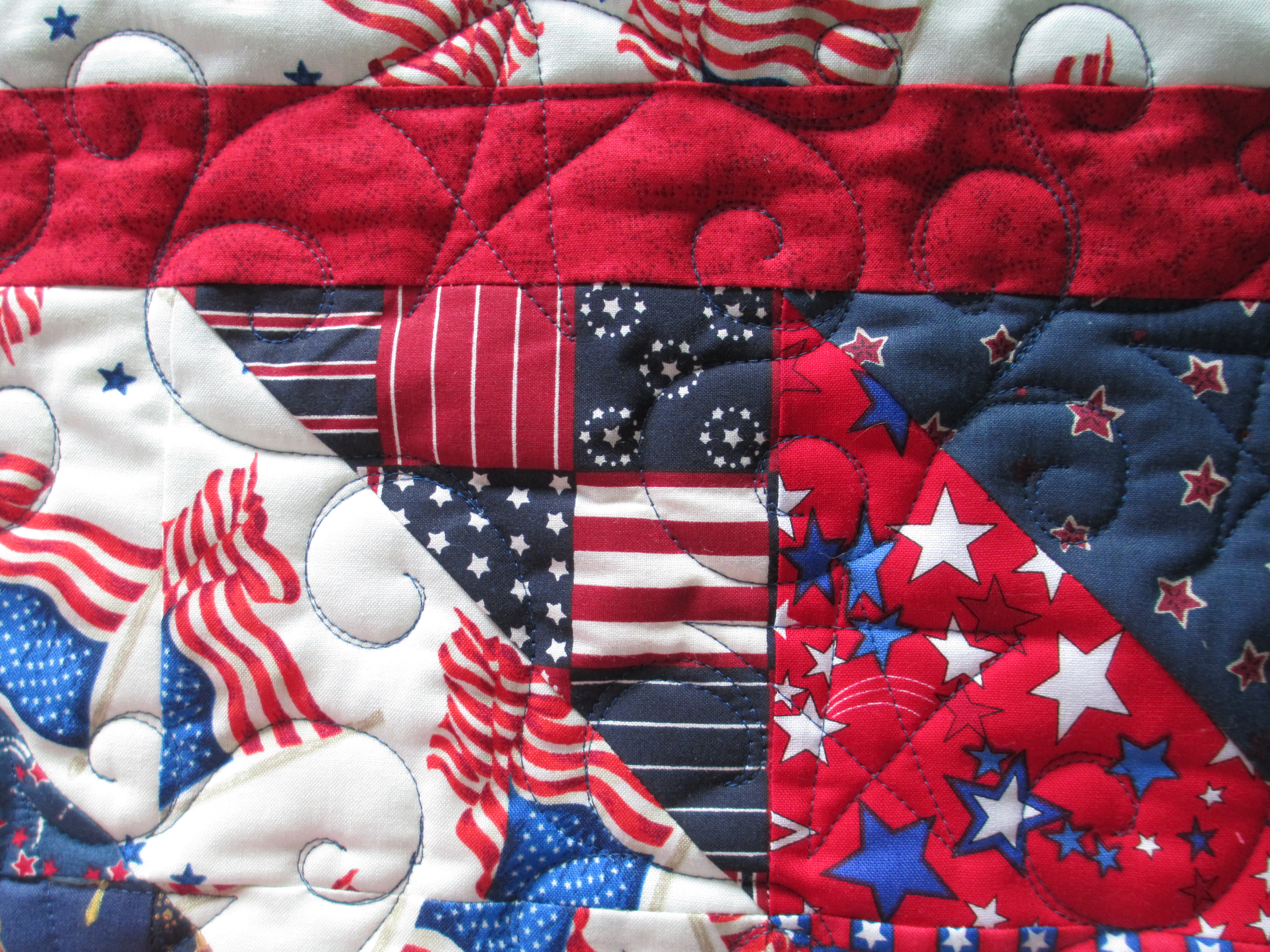 Cynthia wanted an allover design quilted into the body of the quilt with a separate border, which was perfect for this quilt, because the border is a fairly solid color and quilting wouldn’t show too much in the body of this quilt.  This is semi-custom quilting, and it is a great, reasonably priced option for many quilts.  Here are some close-ups of the allover, edge-to-edge quilting done in the body of the quilt. I quilted loops, swirls and stars into this section.