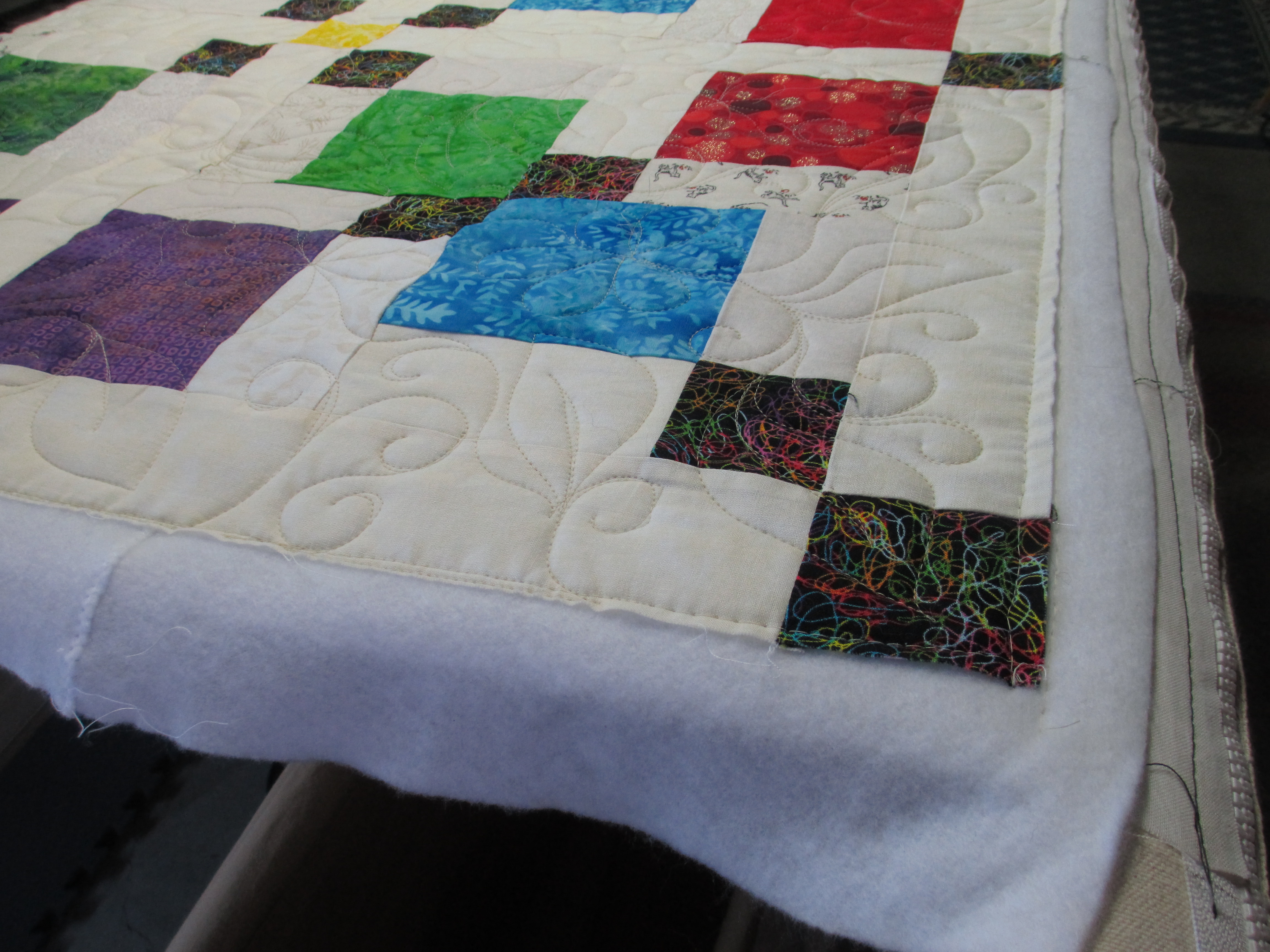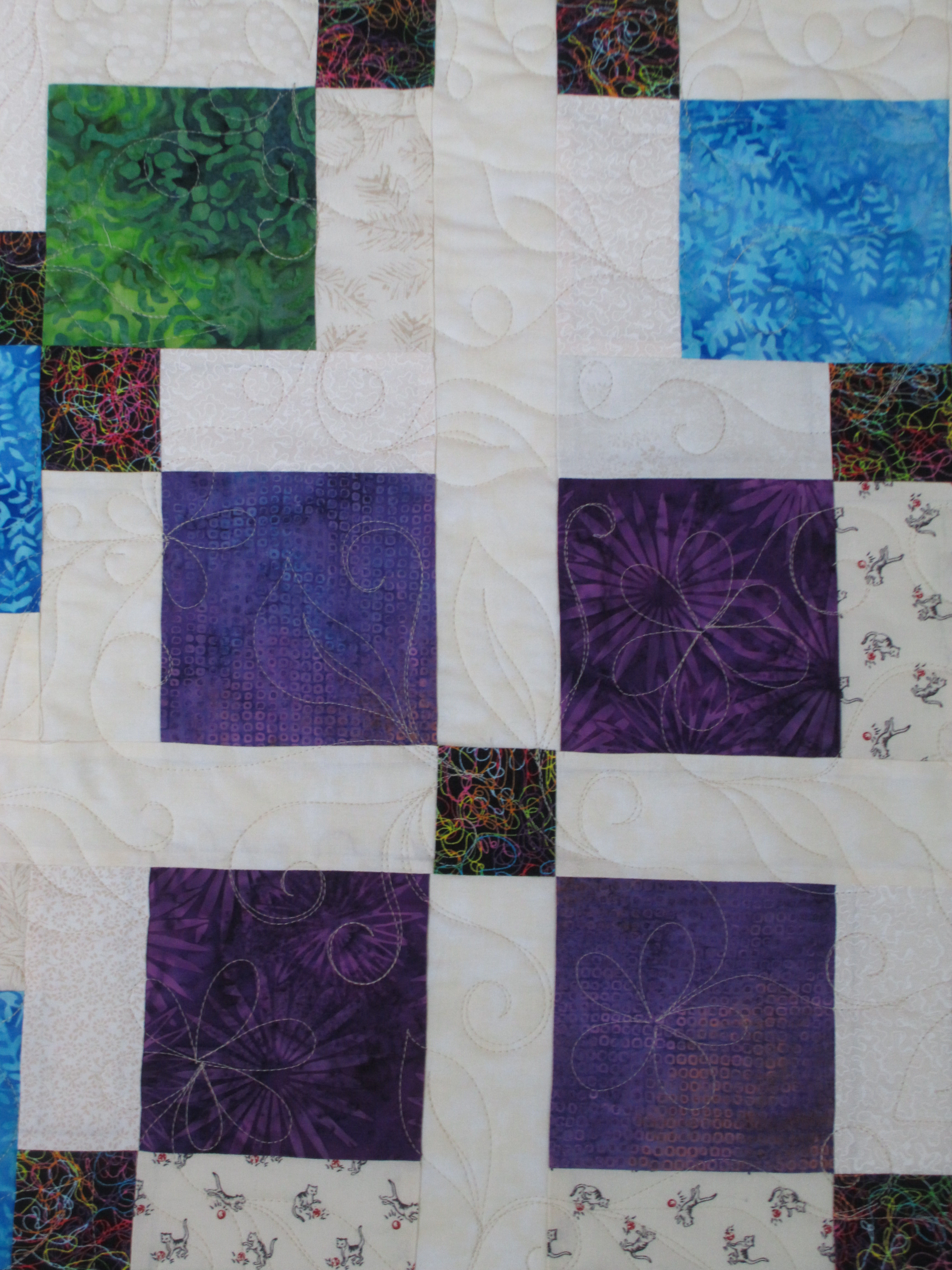This quilt was an easy one to quilt an allover edge-to-edge design on it, which is also easy on the quilt maker’s budget.  The question was what to stitch into it.  Just about anything would go with this, but what would Nancy like?  She lets me choose, and I worry about what to pick for her, so I settled on flowers and leaves.  Everyone has had such a bad winter in the USA this year, except for us, but I still figured the promise of spring would be okay for this quilt.