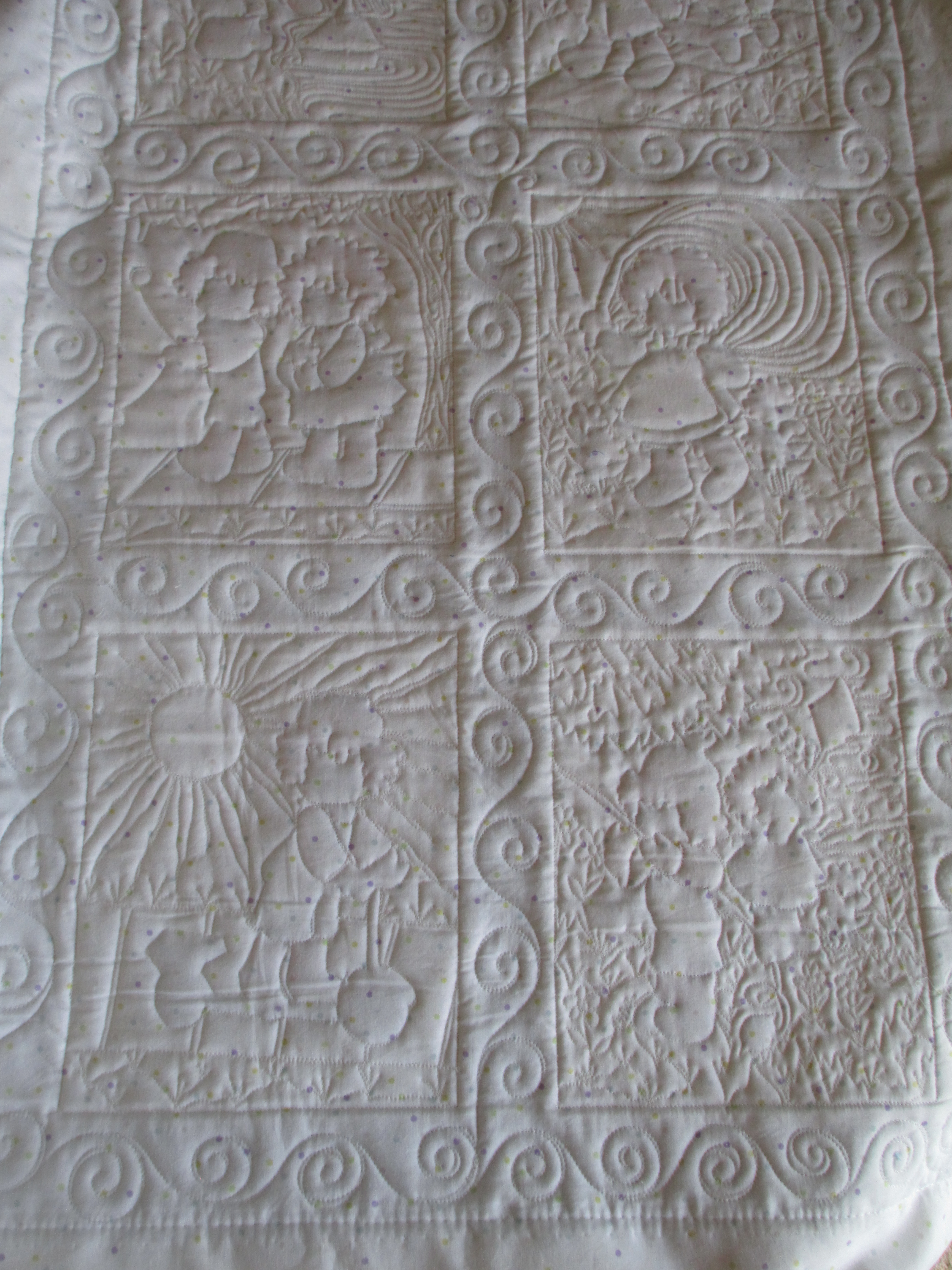 And, here is what I added to the blocks.  There are plenty of things I could have done with this, but I really wanted it to be playful and I was hoping the ladies at Barbara’s church would be okay with it.  Do you think it’s okay and “fits” the quilt?
