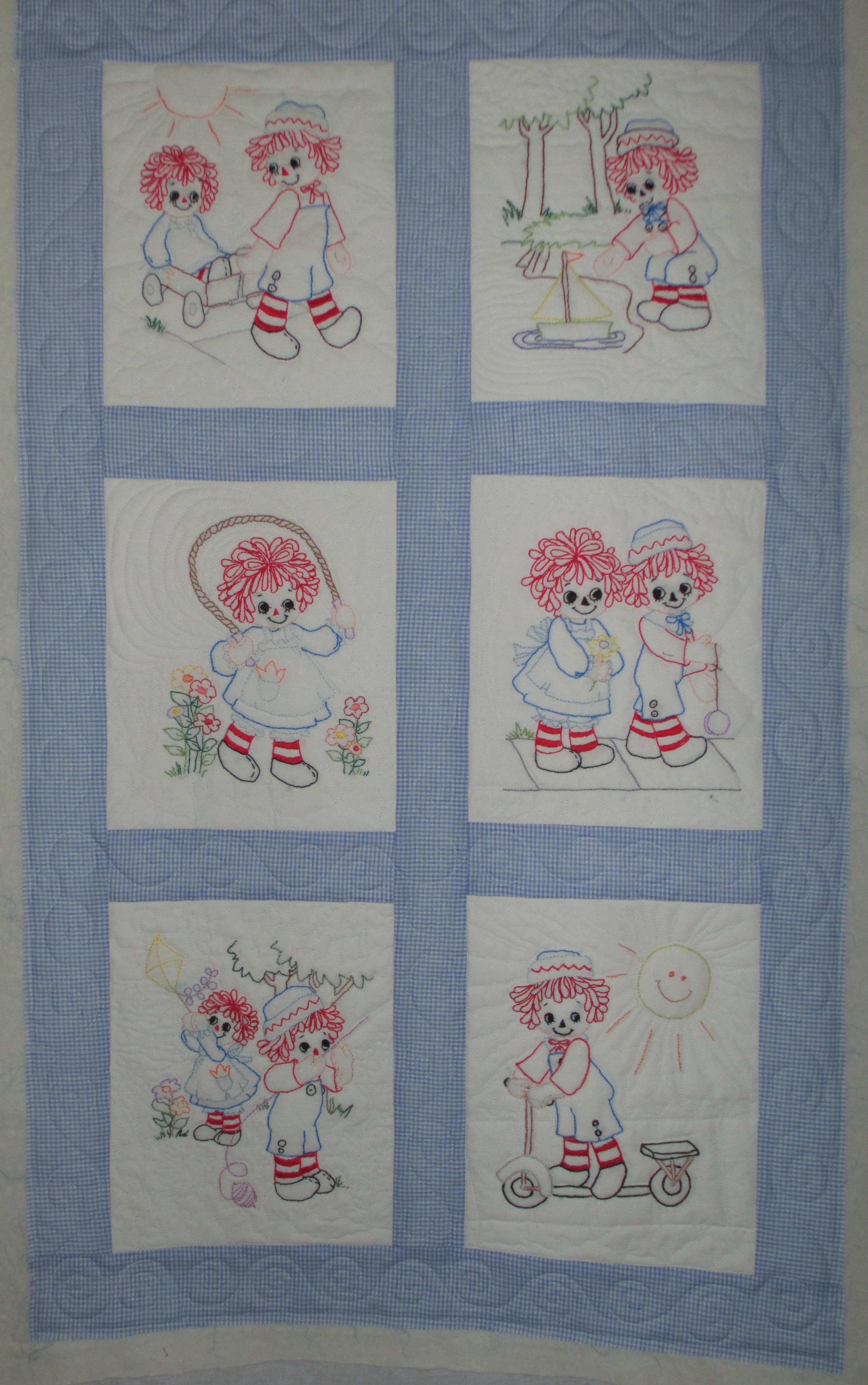 Barbara and the ladies at her church have been hard at work making quilts.  If I understand it correctly, they either raffle or auction them off to make money for their church.  What is really cute about this quilt is that, although it is a Raggedy Ann and Andy quilt, there are hand made dolls to go with it.  Unfortunately, I don’t have a picture of them to share with you so you could see how cute the quilt looks with them.  However, I do have pictures of the quilt.