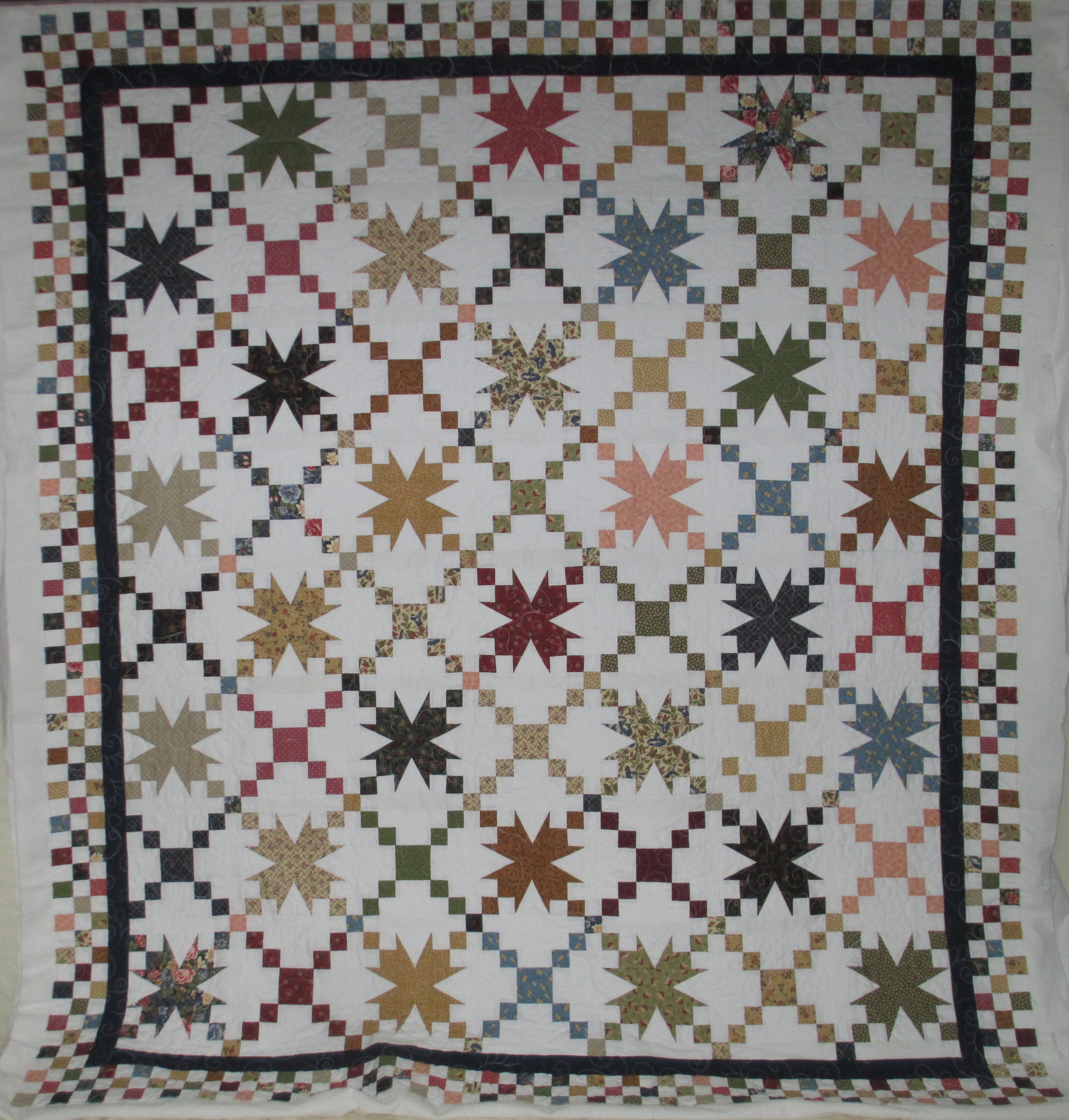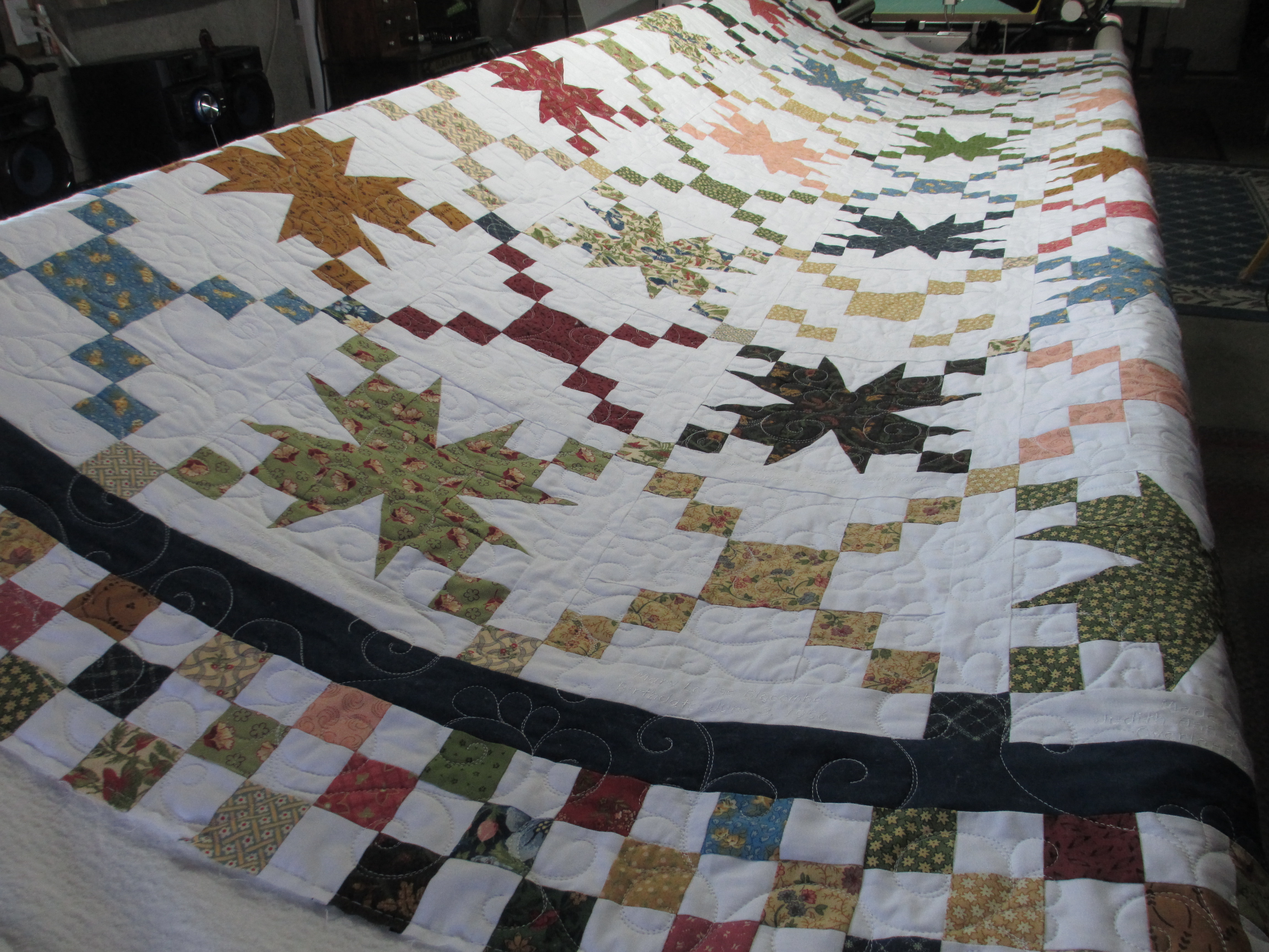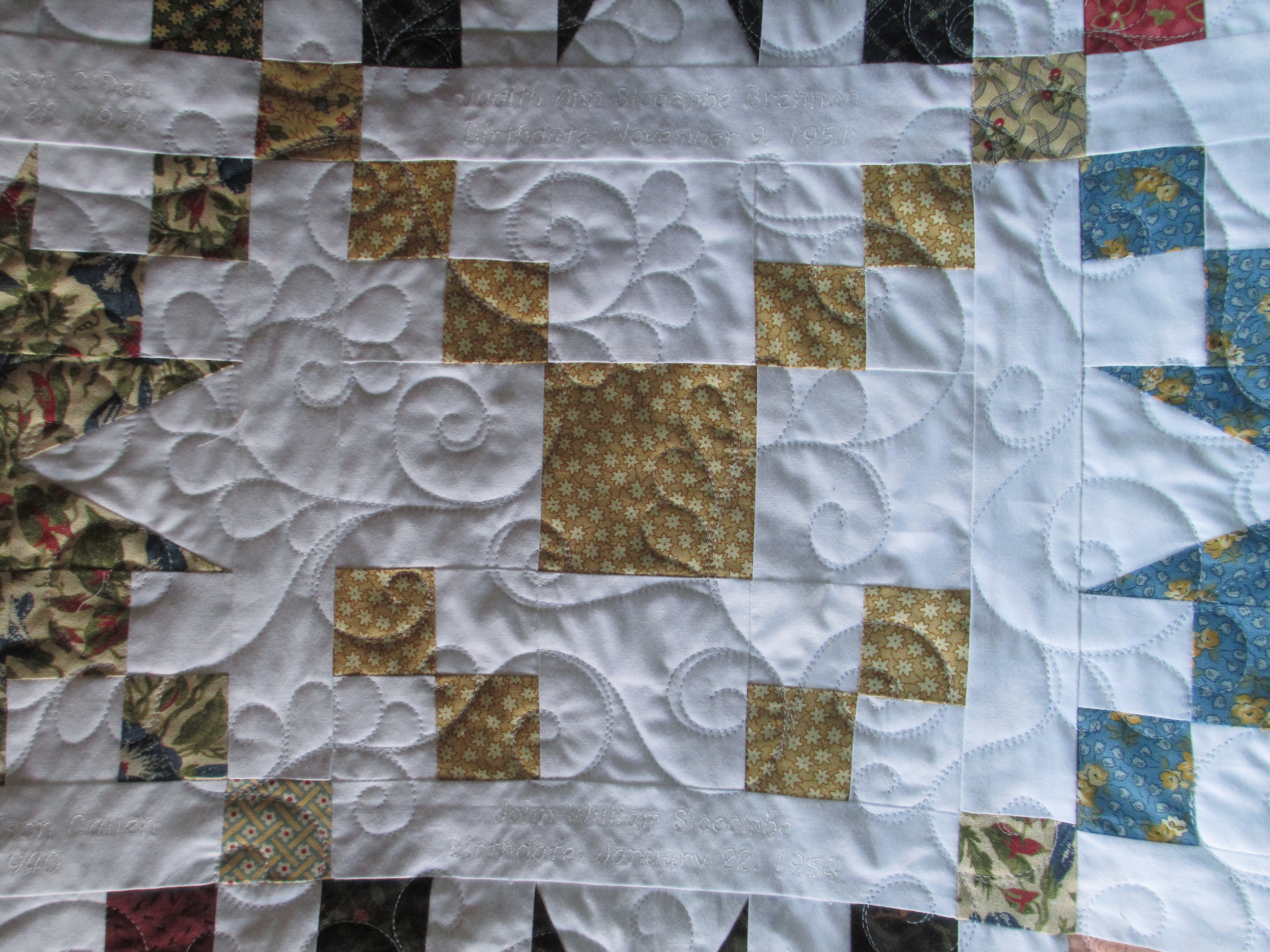 I finally finished it and tried some different quilting techniques on it. Those who know me, know that I try to make each quilt unique and add special touches. And, I’ve done those all freehand. I do not have a computer for my machine… yet. I am saving my pennies… it’s on my bucket list. 😉 But, I have a couple of the quilting designs on this quilt digitized and available for those who DO have a computer for your quilting machine.
