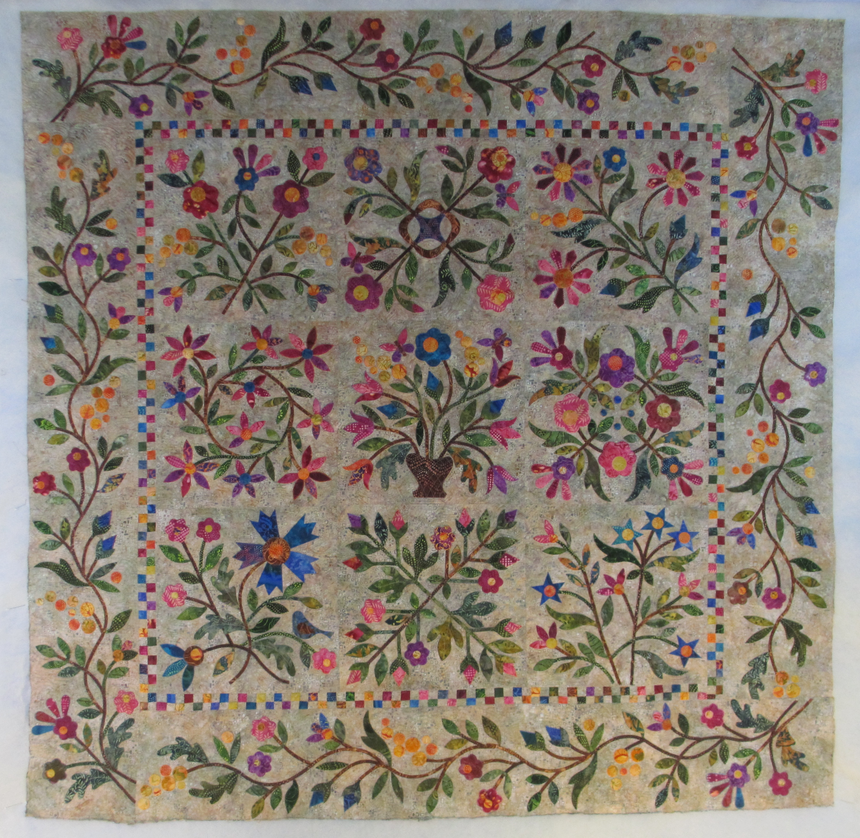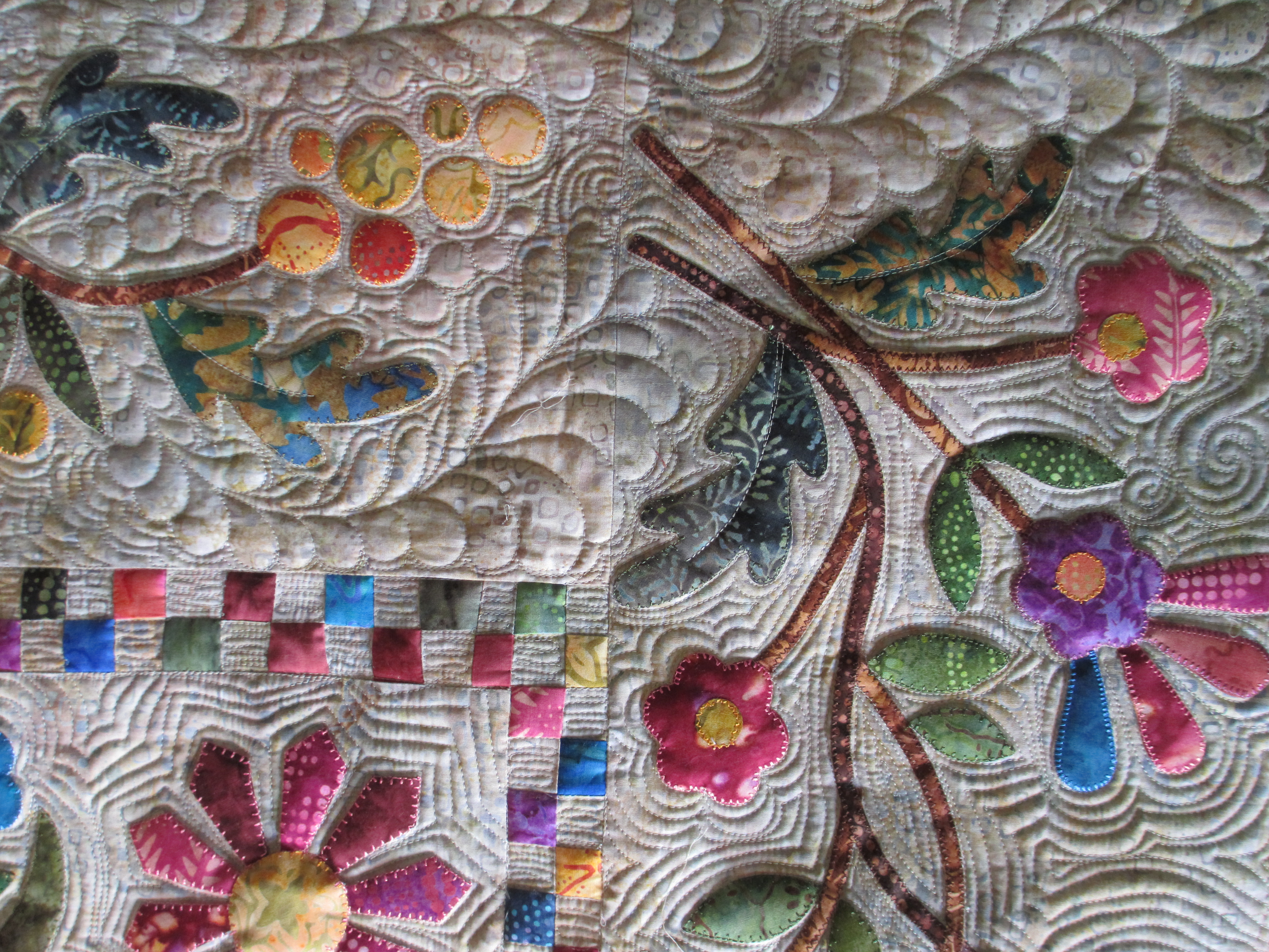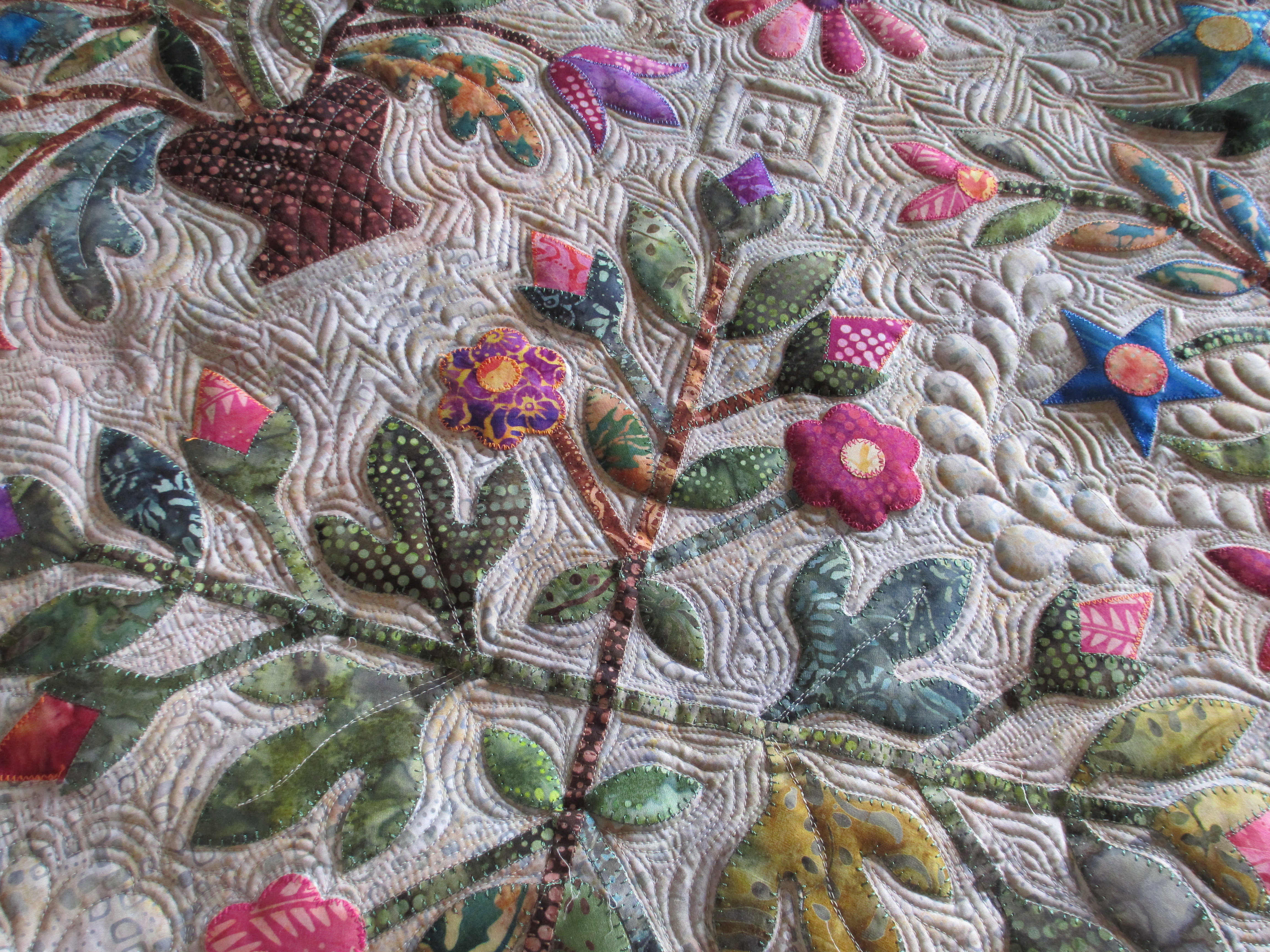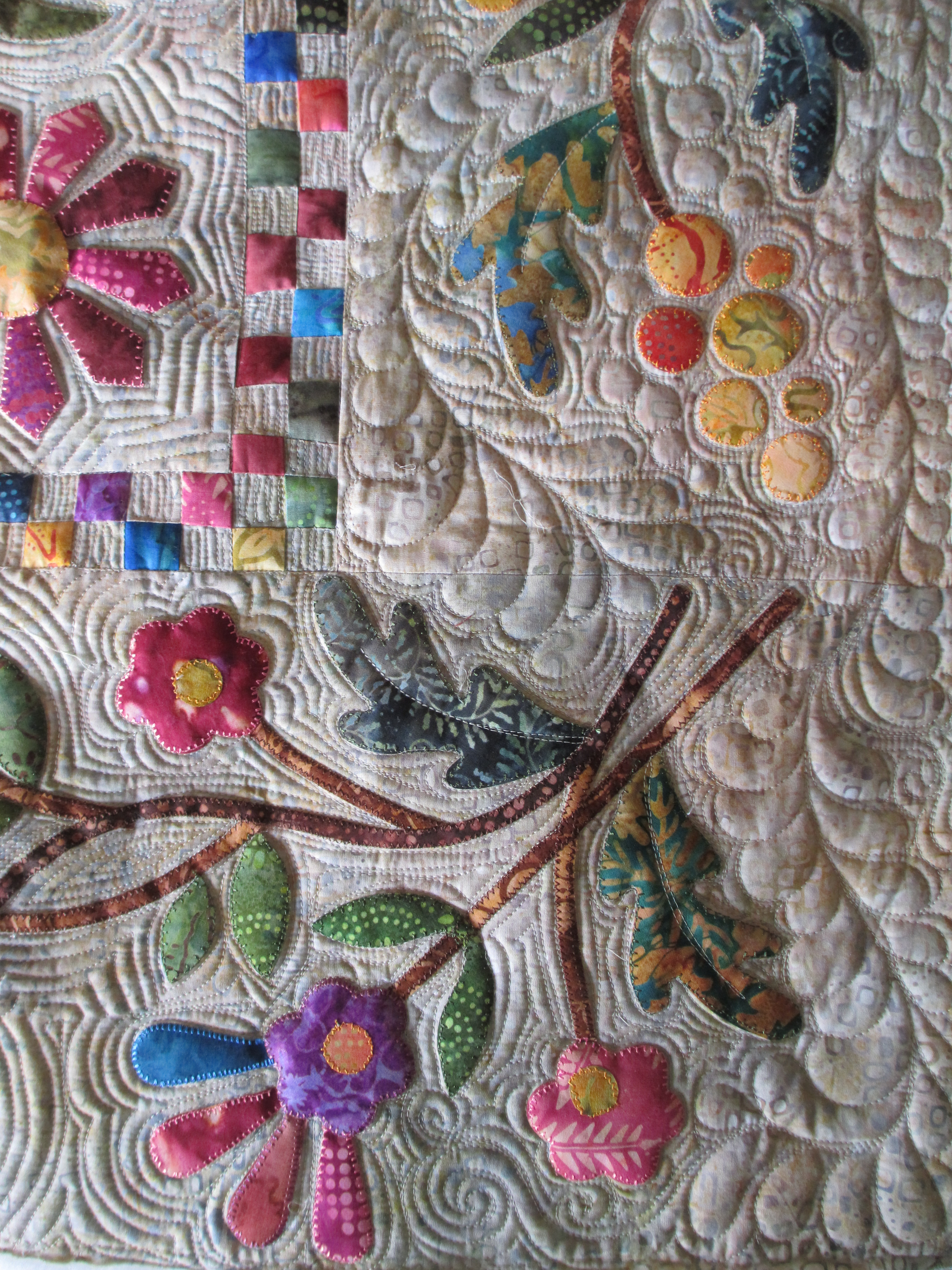 I was surprised at the quilting. I thought I hadn’t done a good job on it, but time passing gives you a new view – it wasn’t as bad as I’d thought. But then, the lighting was very complimentary to the quilting great as it bounced off the trees and tall grasses that were stitched into her quilt.