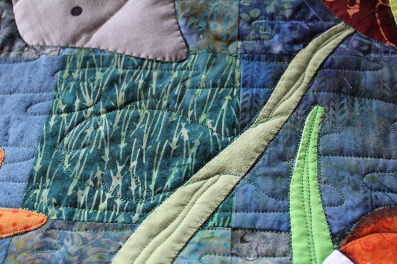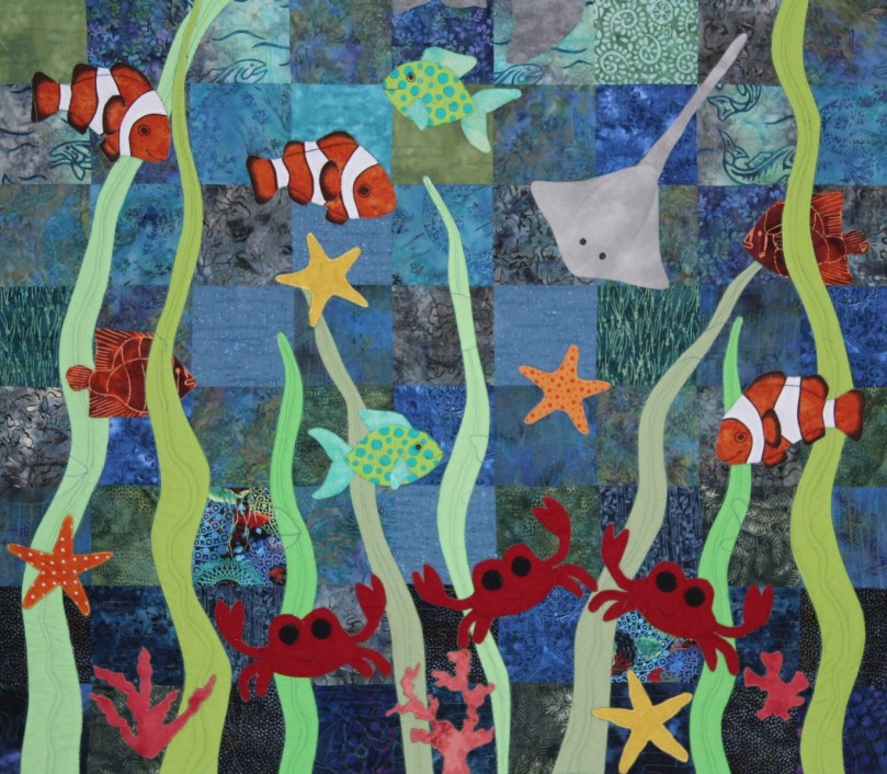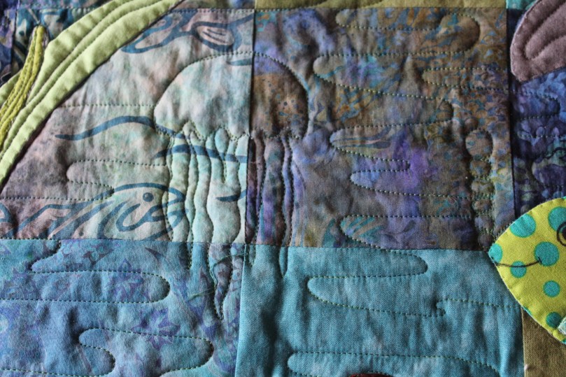 I started out by trying to use up a bunch of charm squares I’d gotten in a fabric exchange (of charm squares) and then randomly placing them with darker colors towards the bottom and lighter closer to the top. That would be my background. The picture above doesn’t do the coloring justice. Now, how to fill it up? Initially I had too many fronds of seaweed. I was randomly making different appliques, trying to fill the scenery. You can always take some away, but I didn’t want to have to make more later. So, I took some of the seaweed away, and I wish I had taken more.