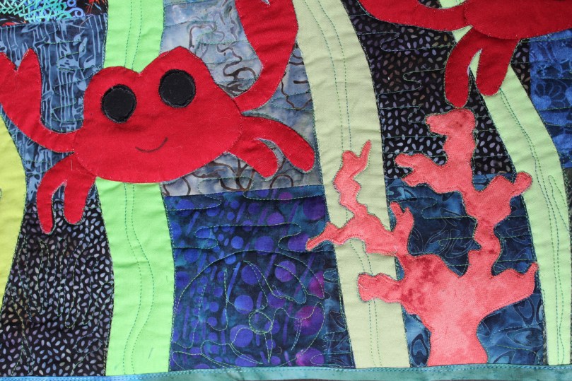 I always learn something with each quilt I make. With this one, I wish I had made it a little more square. I was trying to place all those creatures at the bottom of the sea where they “belonged” and ran out of room. That is the reason for the random starfish elsewhere. I also wish I had made the fish different sizes. The clown fish really are too big, but they are colorful, and I needed that. I don’t know what possessed me to make all the fish around the same size. Lesson learned… thank goodness it’s for a toddler.
