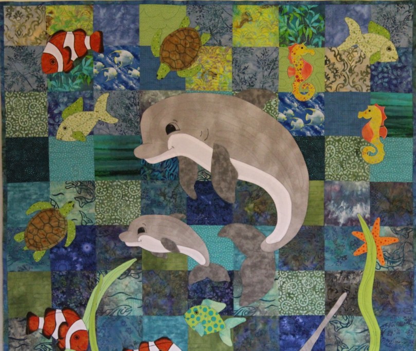 When my daughter was pregnant, she had talked about making an ocean life quilt for her baby-to-be, but you know how pregnancy sucks up your life; that’s exactly what happened. I was already well into another quilt for the baby, so there was no way I could also whip one of these up, too. Time has passed and the ideas never left my head. The problem is how to make a sea life quilt for a toddler that does not look like it should belong to someone older. Well, I put smiles on the creatures faces… ALL of them.