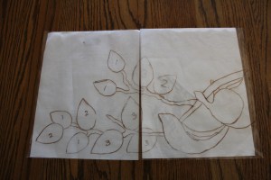Also, if you are wondering how I place appliques on their blocks, I draw out the original design onto a piece of plastic first. This particular piece is one of those pieces of plastic that hold papers together with a strip of hard colored plastic, while the clear plastic acts like a folder for the papers. I use a vis-a-vis marker which stays on there until I run water across it. I don’t know whether or not a dry erase marker would work. If you have tried that and it does, please speak up in the comments.