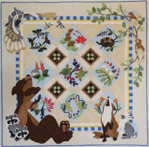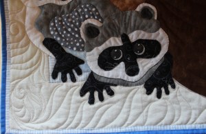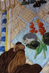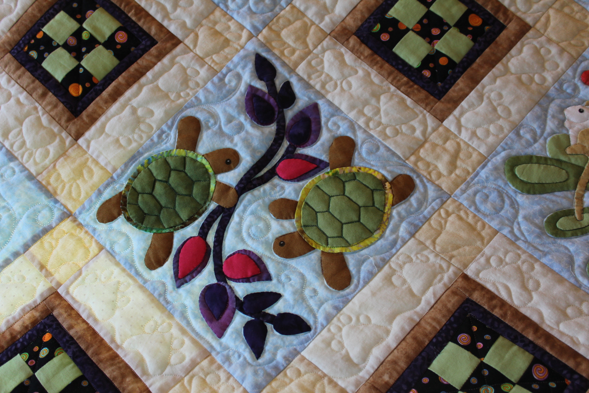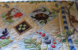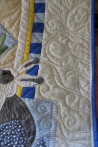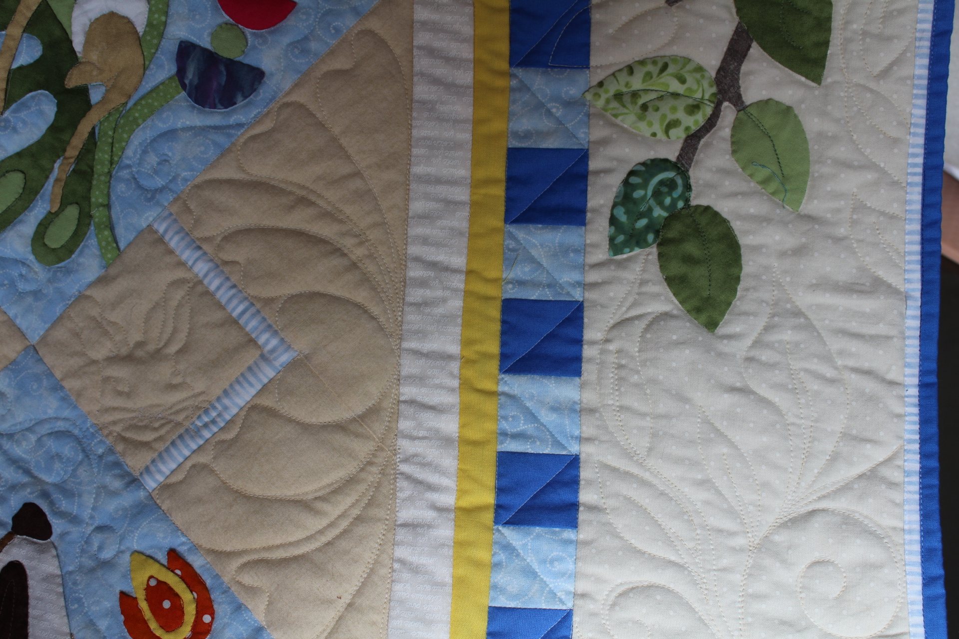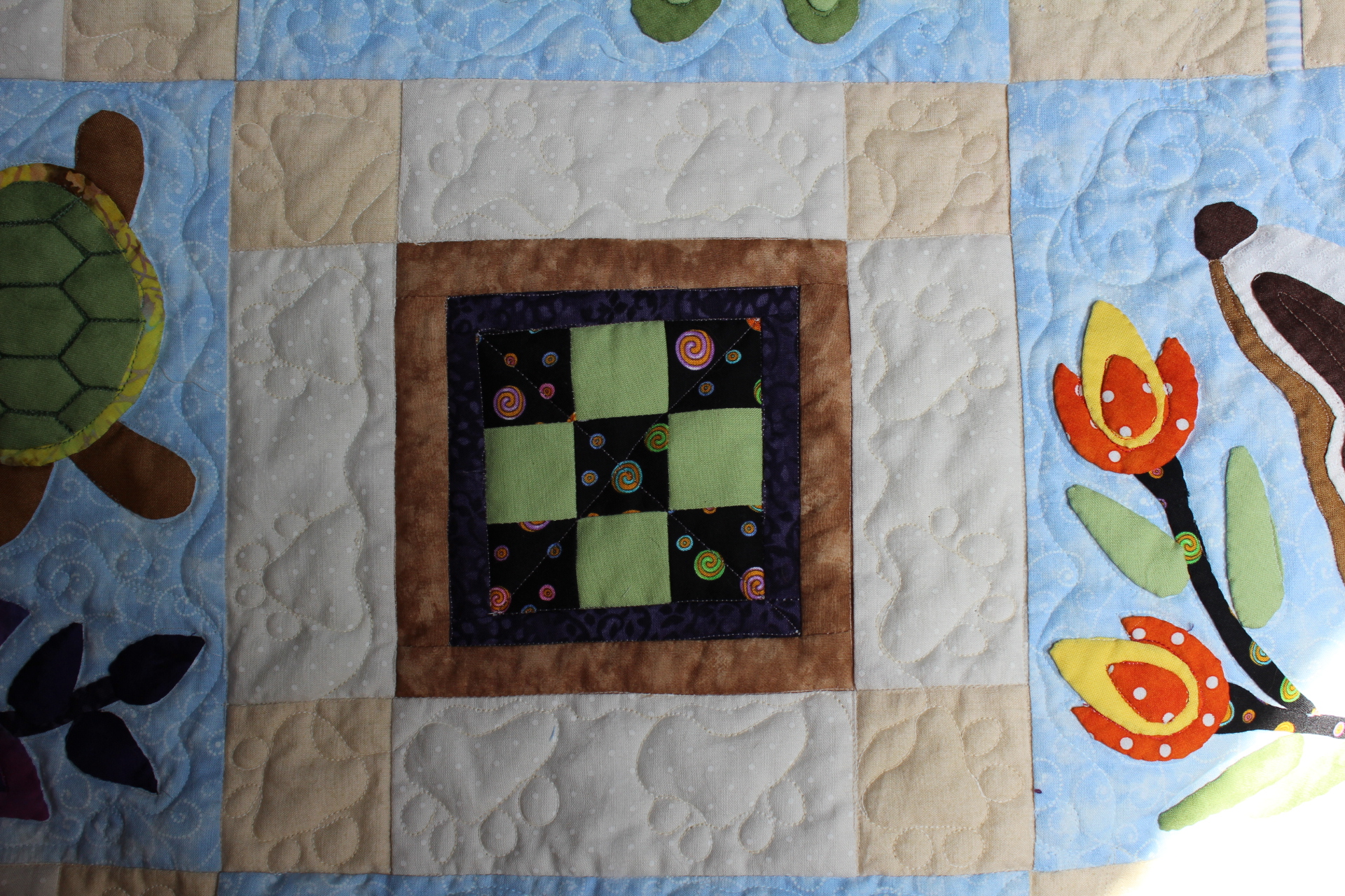 Simple swirls were stitched inside the appliqued blocks around the animals and flowers. My instinct was to put something formal on the outside edges of the pieced blocks, but I ended up putting animal paws there instead. They are not perfect, by any stretch of the imagination, but it’s okay (Let it go!). The way you make these animal paws is to stitch a curvy triangle with 2 ovals going up one side and 2 ovals going back down the other side, all as a continuous path with no starts and stops.