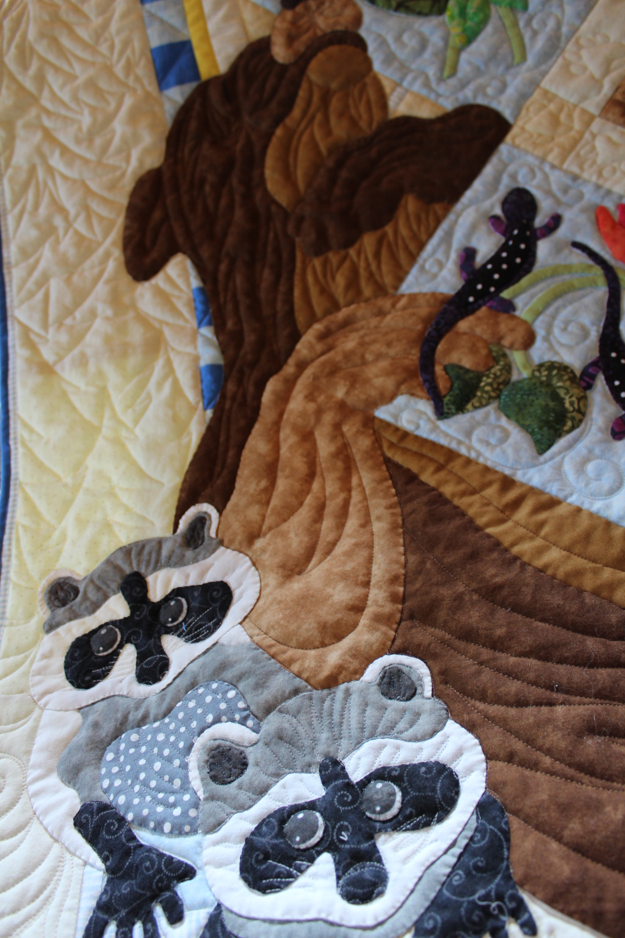 Moving up the sides, I stitched pine trees on the left by the raccoons and bear. My pine trees got worse as I stitched more and more of them (Let it go!) up towards the owl.