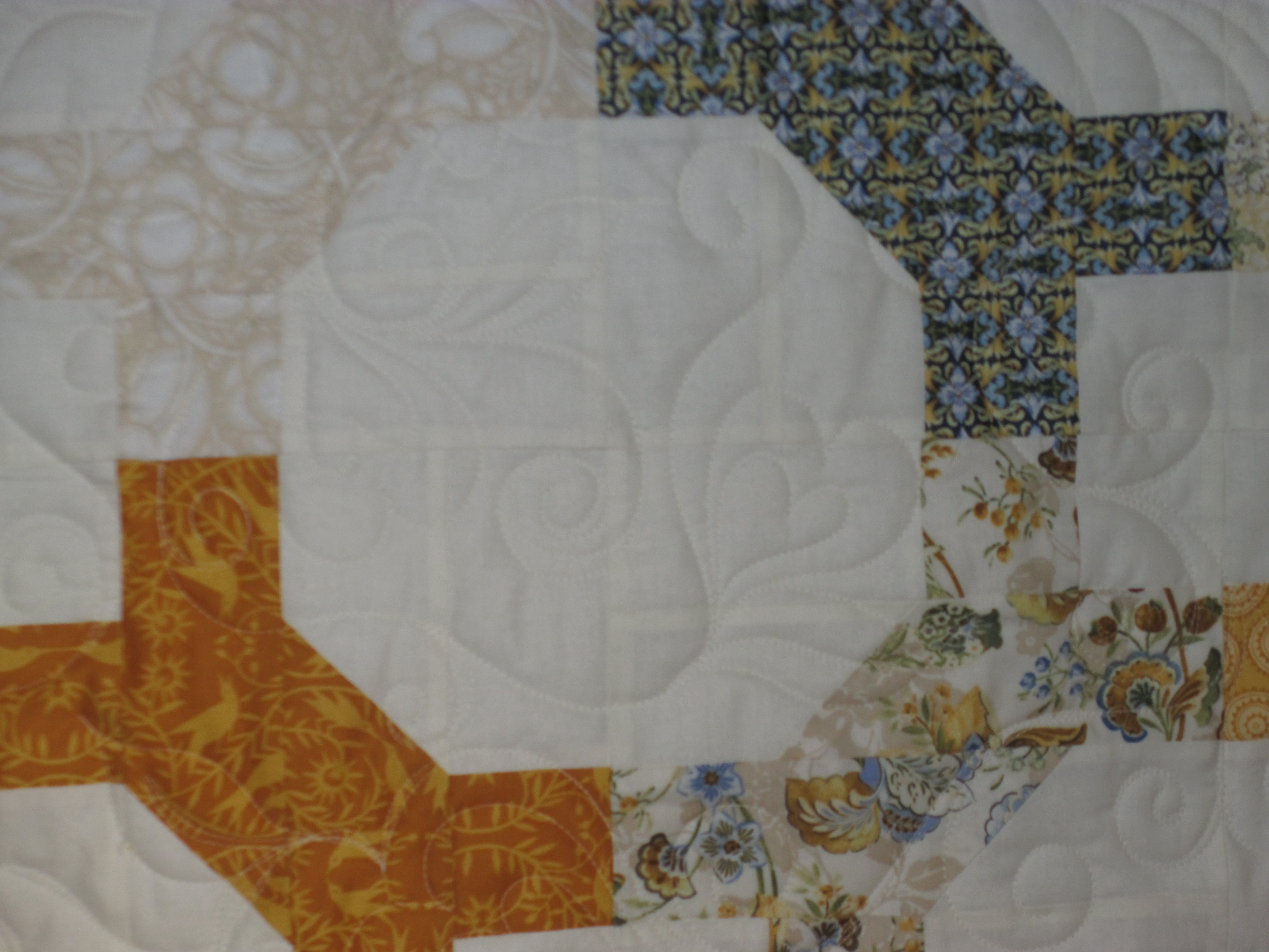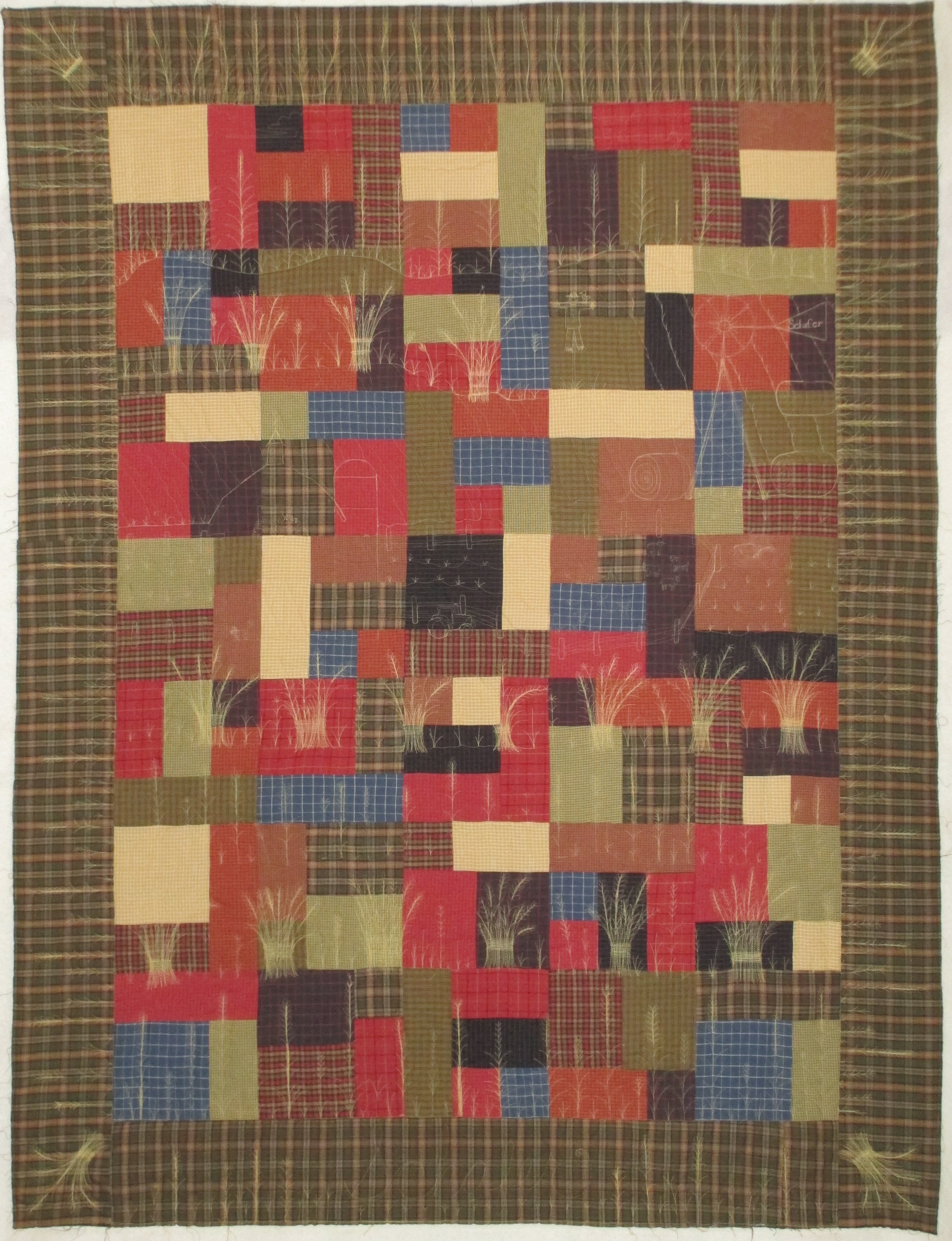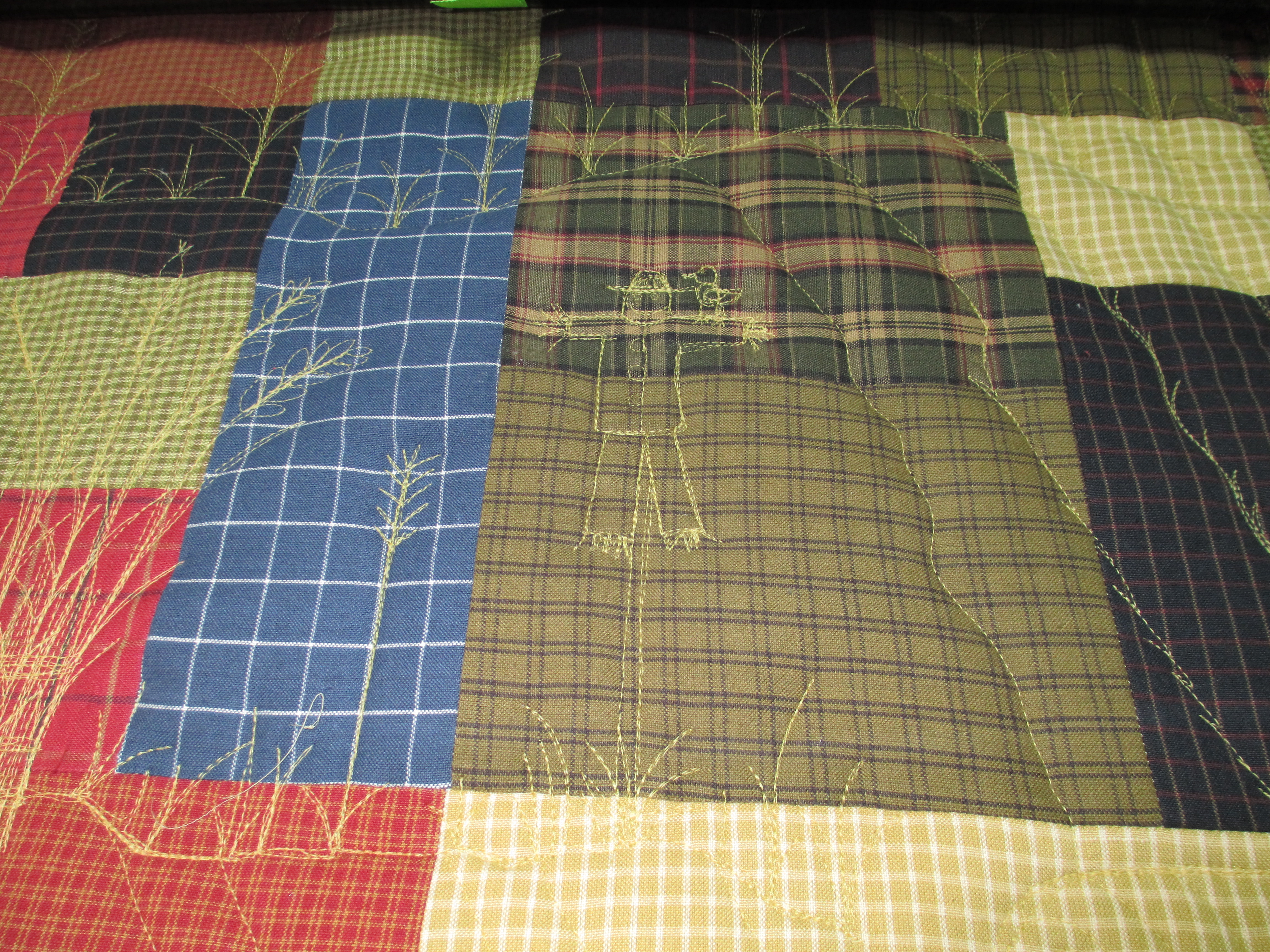And, that, my dears, was my UN-doing. At that point I could see all sorts of things on this quilt top. The patches reminded me (as they did Claudia also!) of looking down from an airplane at the fields of patchwork land. And, I wasn’t sure the wheat was what she wanted after all. Don’t get me wrong; I thought it worked well, but it seemed like it needed something, and if Claudia wasn’t happy with it, there’d be an awful lot of frogging (rip it! rip it!) to do.