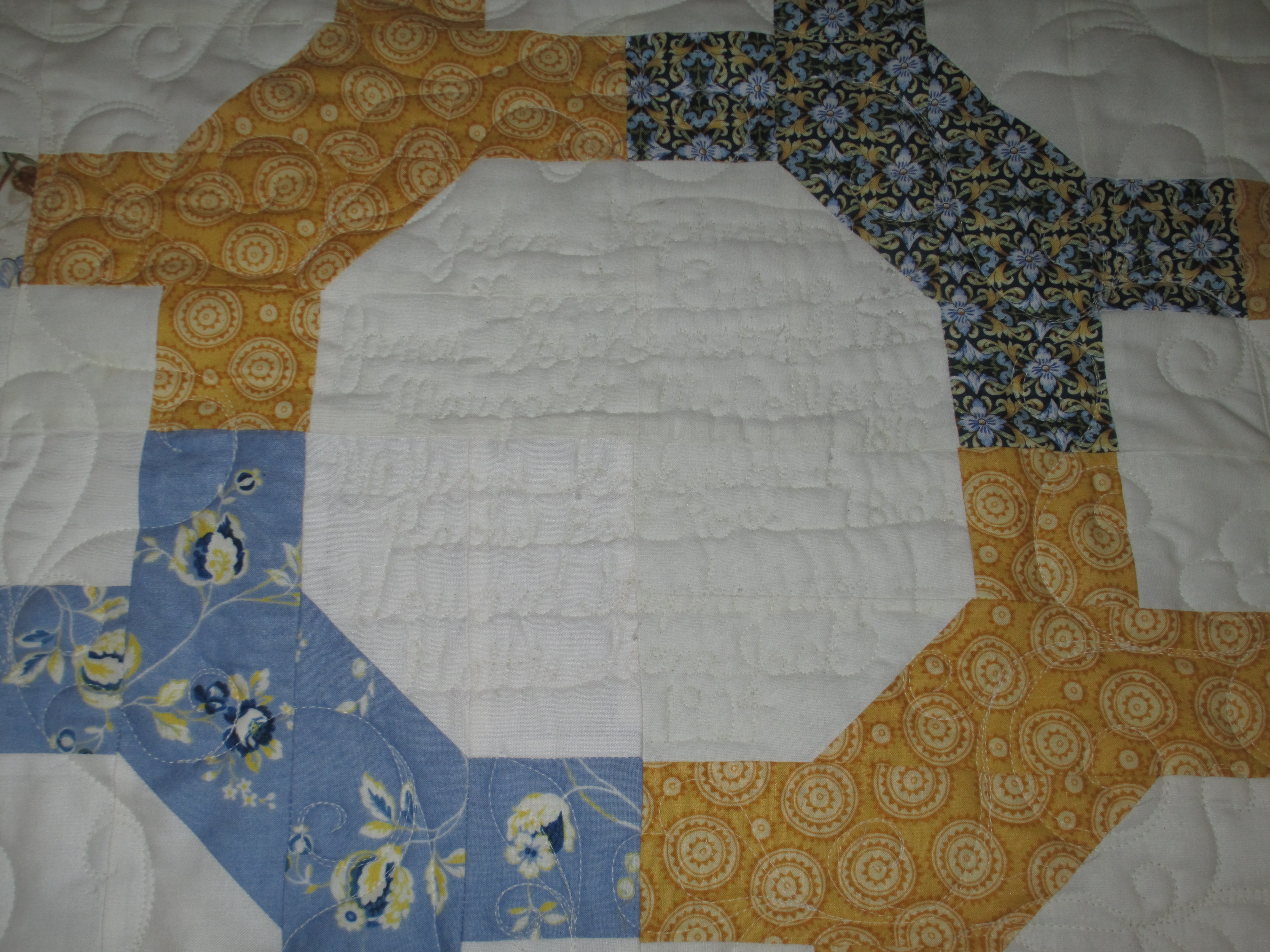 And, I added some early generation names/couples with years. I think if I were to do it over again, I’d put the couples in their own block with the following generations in blocks below them. That way, the quilting density would be more even.