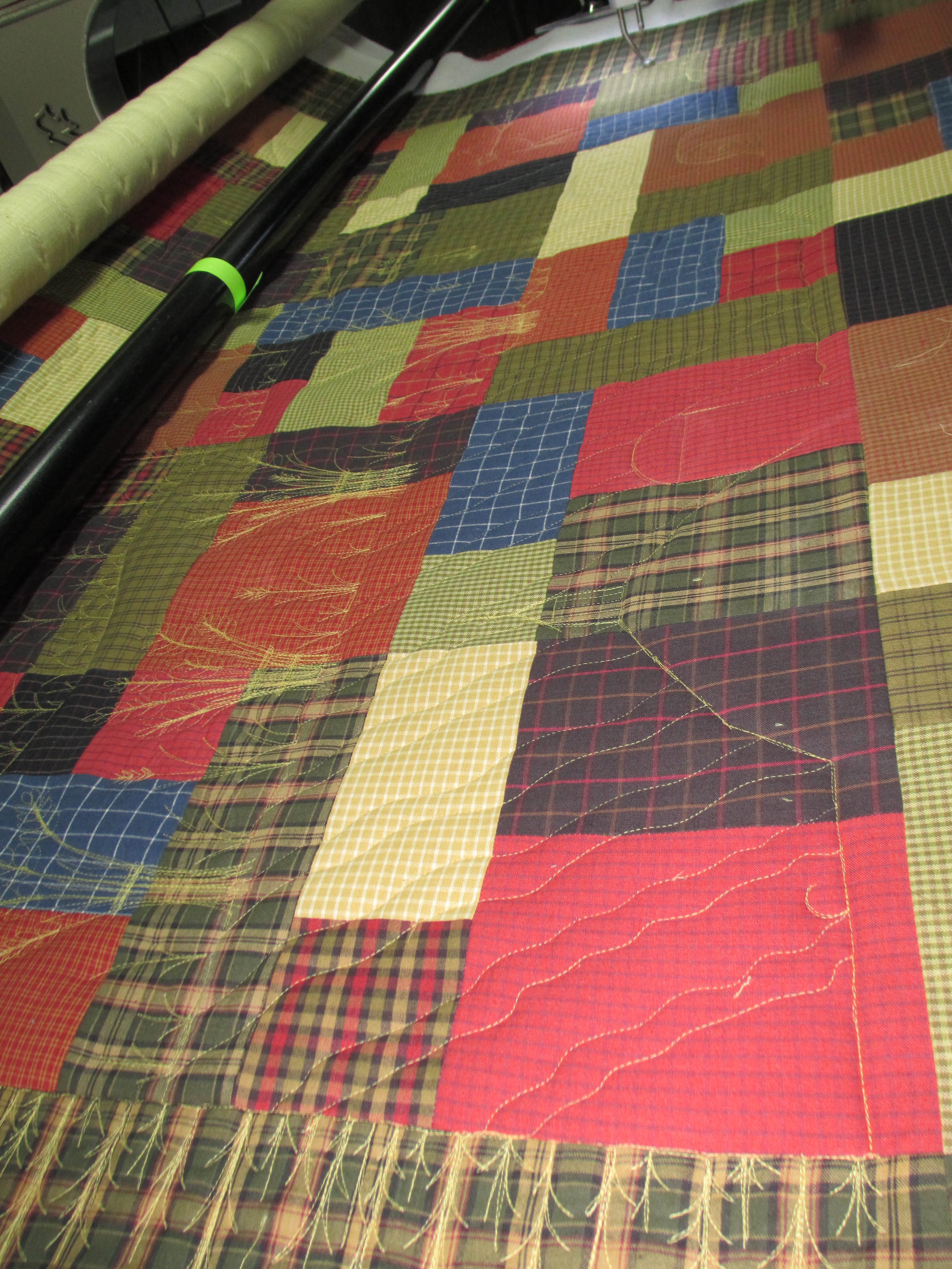 Another quilt I’ve been working on in May was Claudia’s quilt. This quilt did a number on my head. Not that it was Claudia’s fault by any stretch of the imagination. She is a dear and was a dear for being so patient with me during and after my mini-melt-down with her quilt. It took me a couple of weeks to finish it. This quilt is a Christmas gift for her brother, who is a farmer. I think Claudia is smart for working on her Christmas gifts all year long and not waiting until the last minute. She’s bringing them to me as she finishes; smart move since I am now booked until September. Each quilt I receive after today will get in the queue and before I know it, I will be booked through Christmas. So, if you are thinking about quilts for Christmas, let your quilter know as soon as you can! Some of us are booked a year out and some are booked only a few months out.