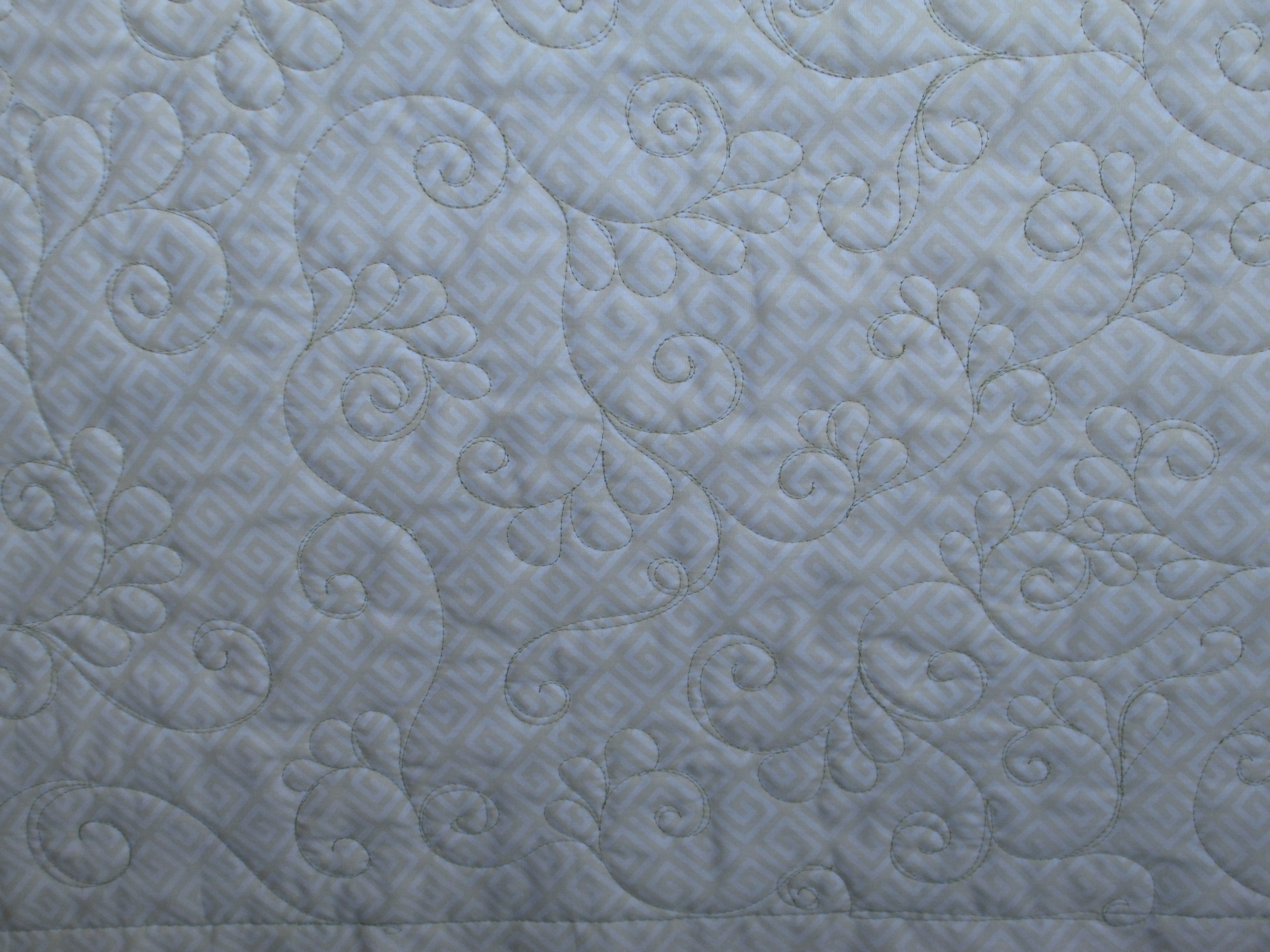 I could have done any number of variations of feather styles on Wilma’s quilt, but I liked the way the feathers in the picture below cradled the bouquets of flowers. I thought they complimented the pieced blocks nicely.
