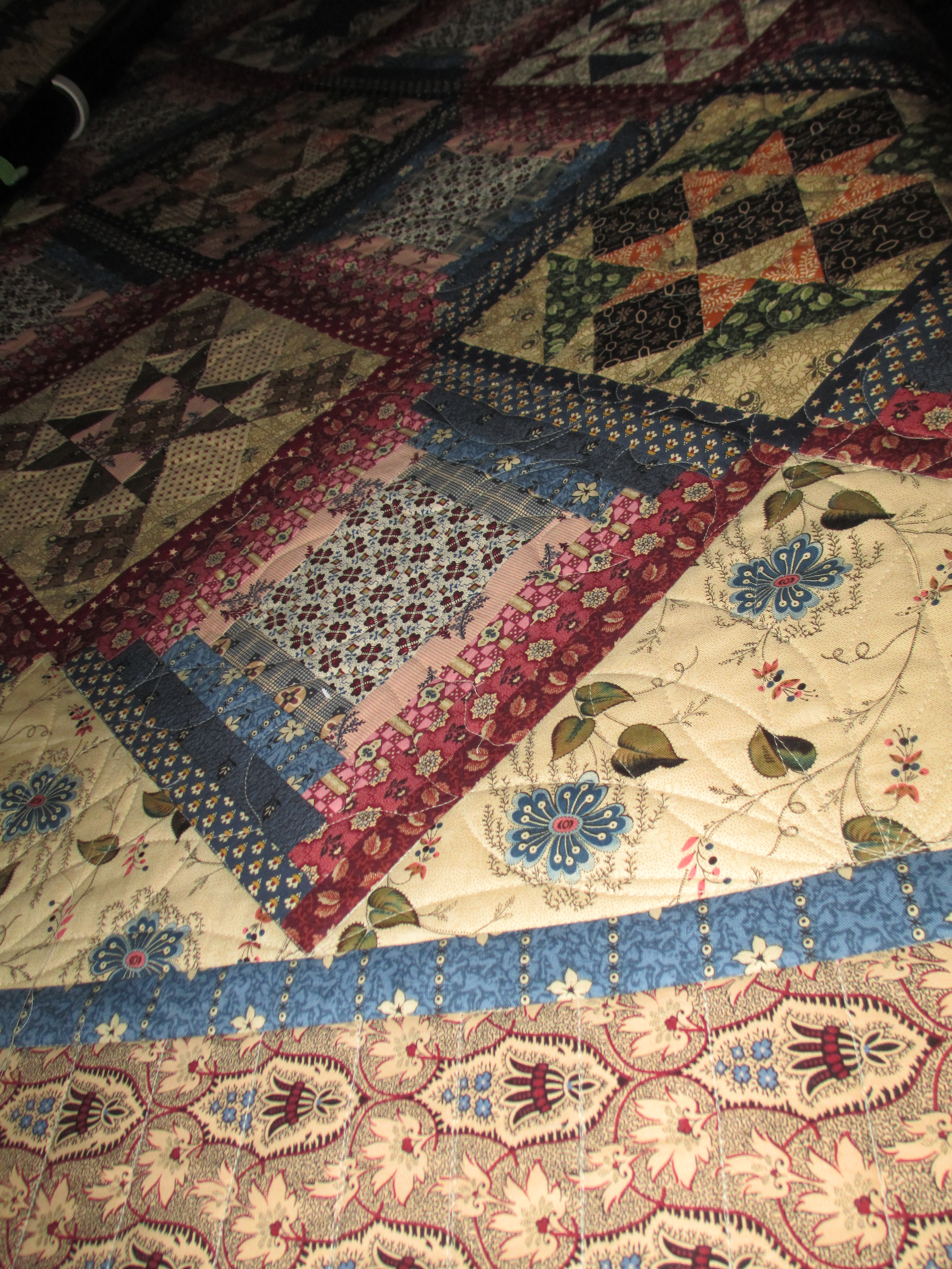 To distract myself from dwelling too much on the “whys,” I’ve been working on my never ending “to do” list. I have only a few pictures to share. First off, I finally finished a charity quilt I’d had for awhile. I filled it with feathers, but they are not my best feathers – that was the day the doorbell kept ringing, which made the dog bark non-stop (someone was working on our broken porch, but they haven’t finished it yet – that was Sept. 25), and the phone rang off the wall as well. I was one jumpy quilter that day.