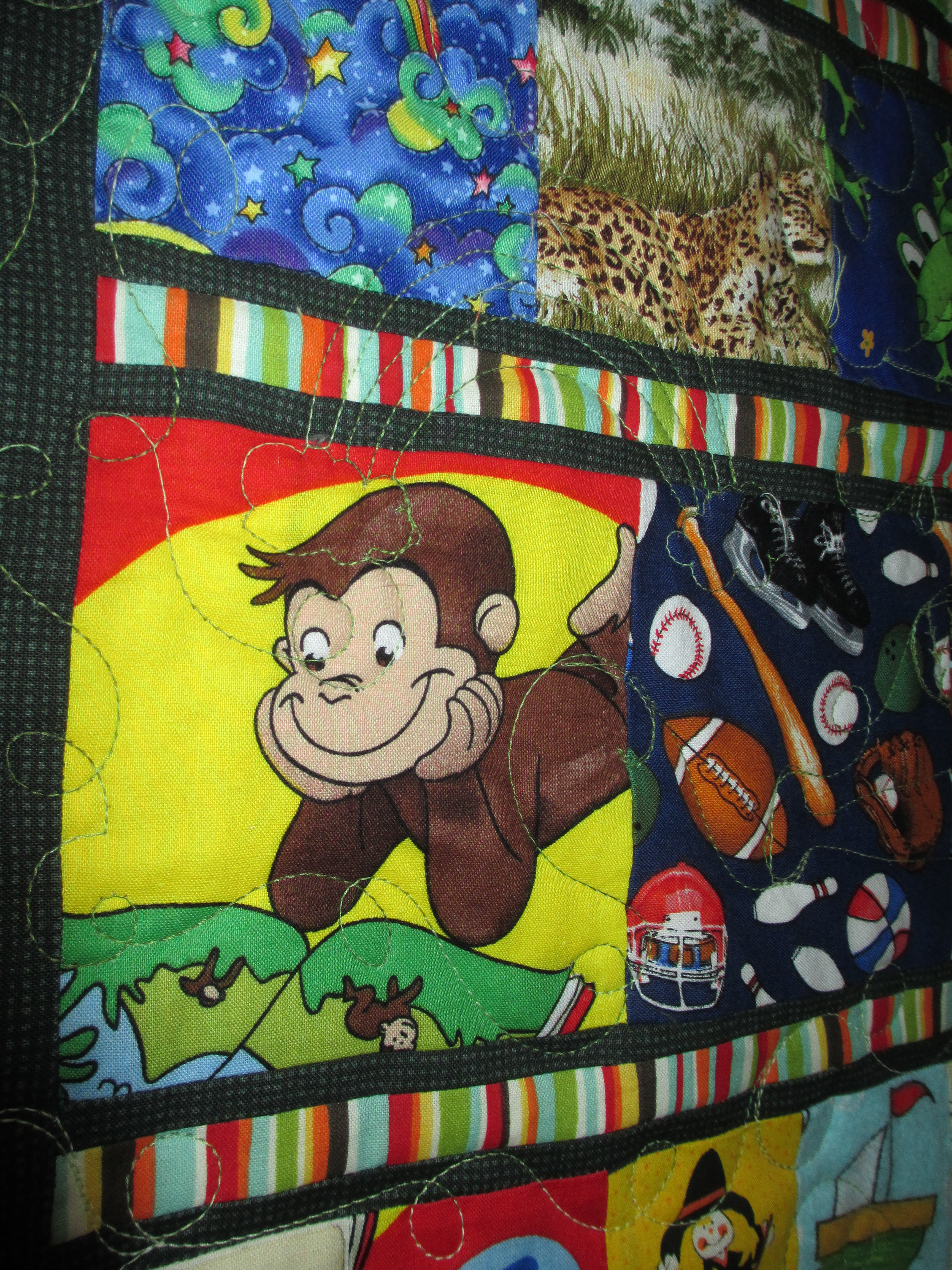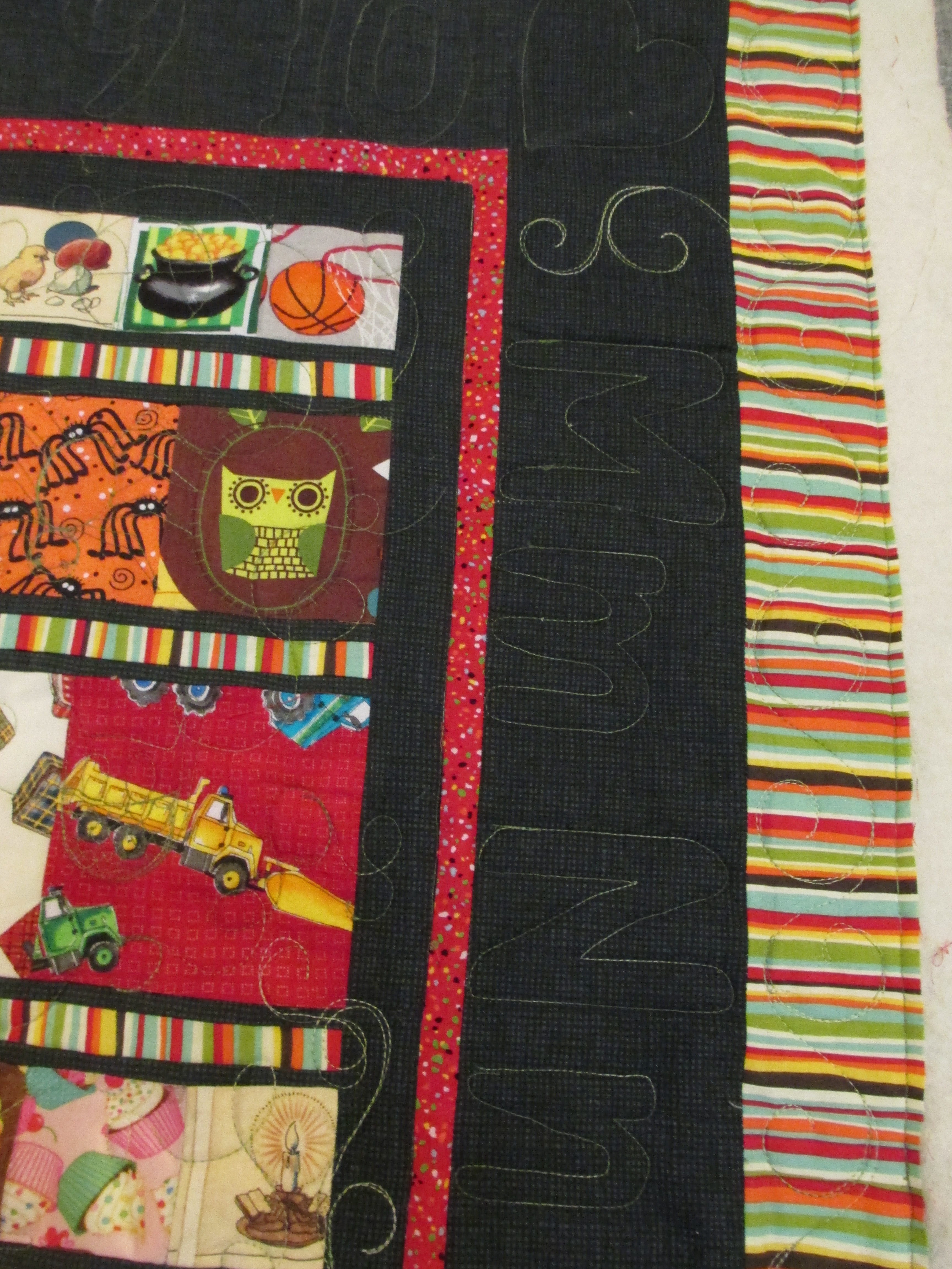 I doubt you can see much of the quilting, but I added numbers and the letters of the alphabet around the borders.  Inside the borders I just quilted and Edge to Edge (E2E) of assorted drawings of things I saw in the quilt.  I hope Charlotte and her grand-daughter have a lot of fun with this quilt!  I know I did!