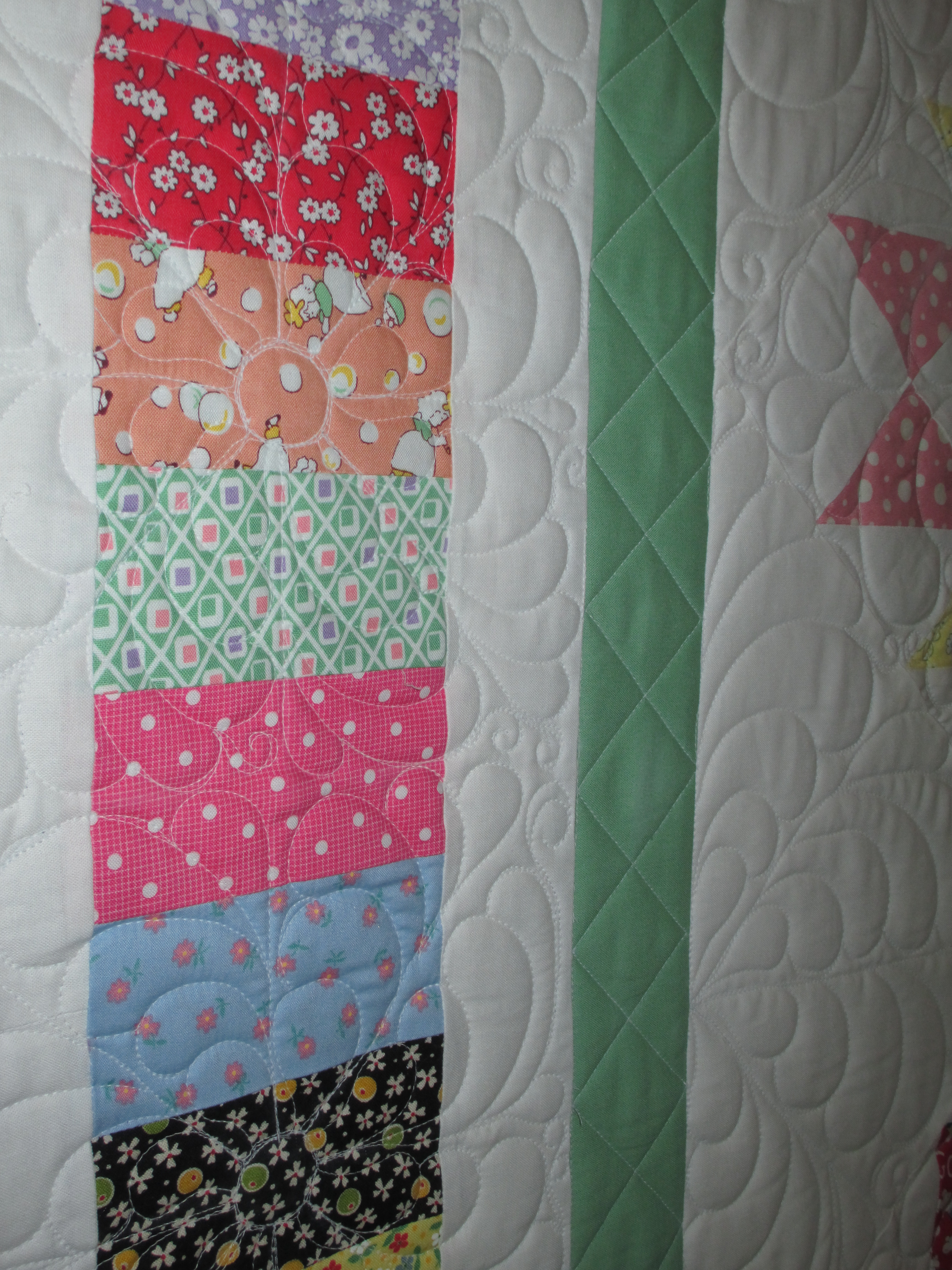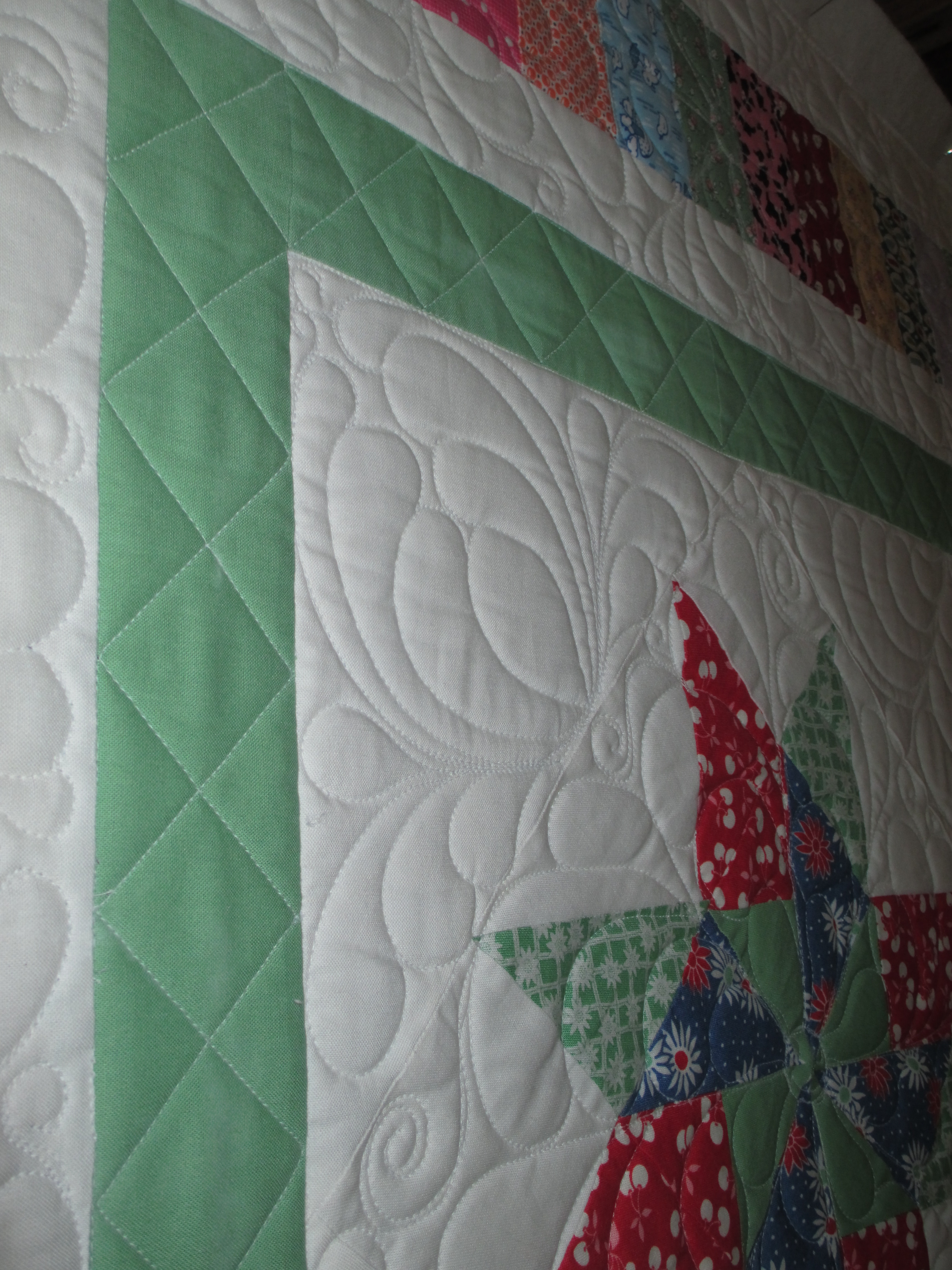 Claudia chose feathers and swirls for her quilt, so she got some swirls and she got a ton of feathers on this quilt. The swirls were done in the sashing and interspersed into the feathers as well, but the bulk of the quilt has feathers galore, for what I call a “bouffant” look. 🙂 There are triangular feathers in each block and twirly swirly feathers in the border.